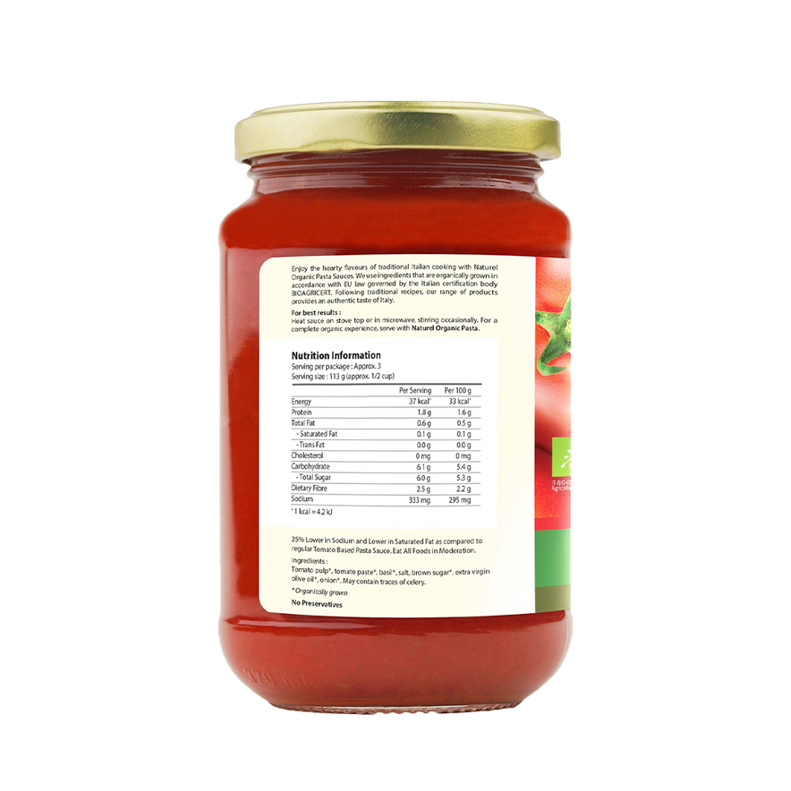 Naturel Organic Basil Pasta Sauce is made from organic tomatoes, basil, and olive oil for a fresh, aromatic sauce. Perfect for pasta, pizza, or as a base for Mediterranean dishes.
