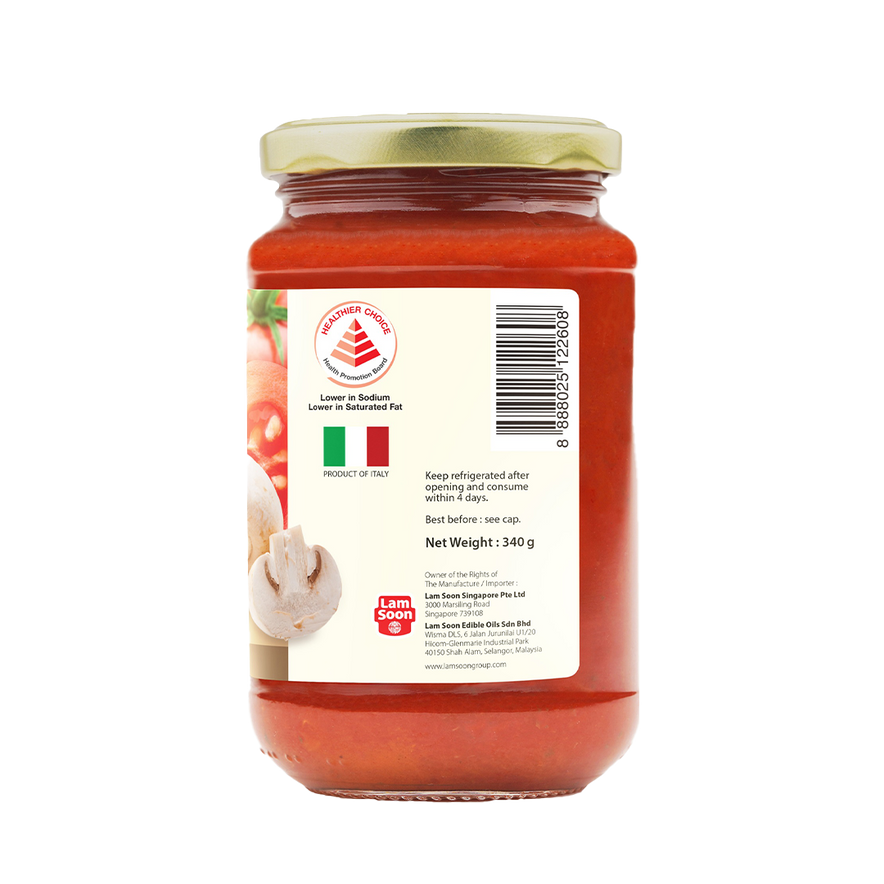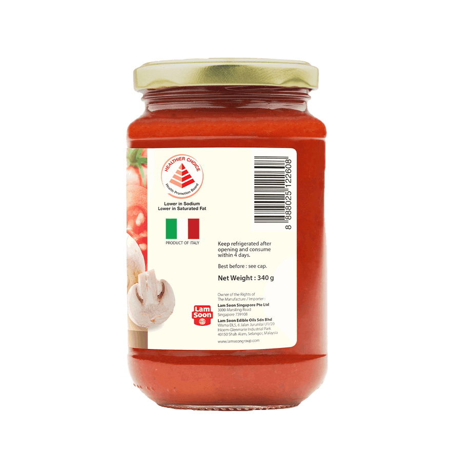 Organic tomatoes, organic mushrooms, organic olive oil, organic onions, organic garlic, sea salt, and herbs.