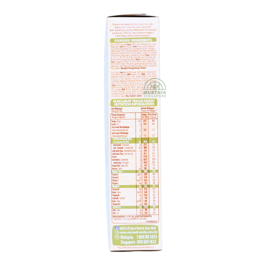 Rice flour, skimmed milk powder, vegetable powder (carrot, pumpkin, spinach), vegetable oil, vitamins (A, C, D, E, B1, B2, B6, B12), minerals (iron, zinc, calcium)