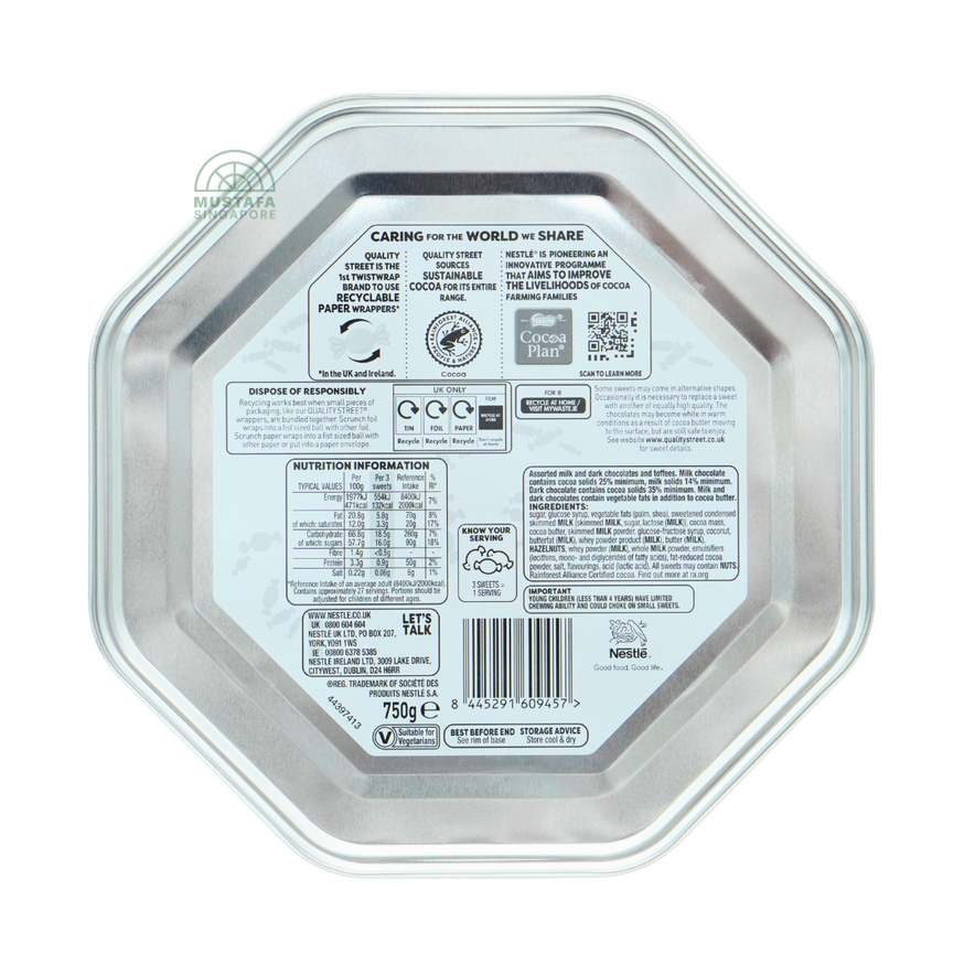 Quality Street 750g includes a colourful assortment of milk and dark chocolates with caramels, toffees and fruit-flavoured centres. Each piece offers a unique taste and texture experience. Ideal for sharing at parties or family events. The iconic tin is both festive and collectible. A beloved favourite enjoyed across generations.