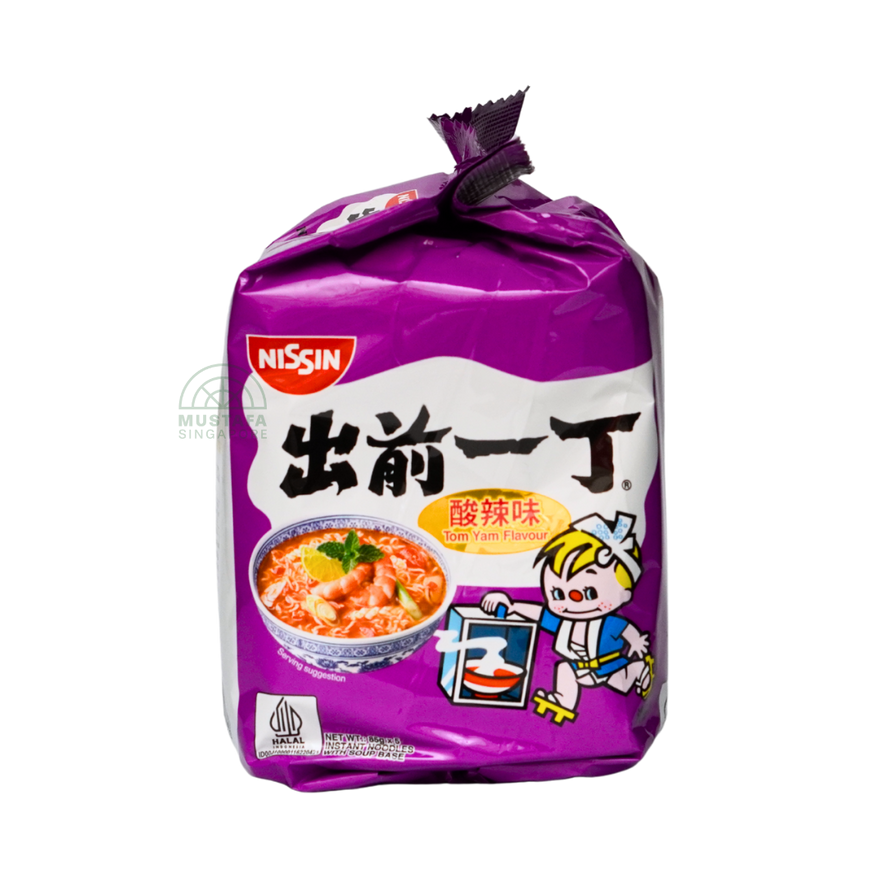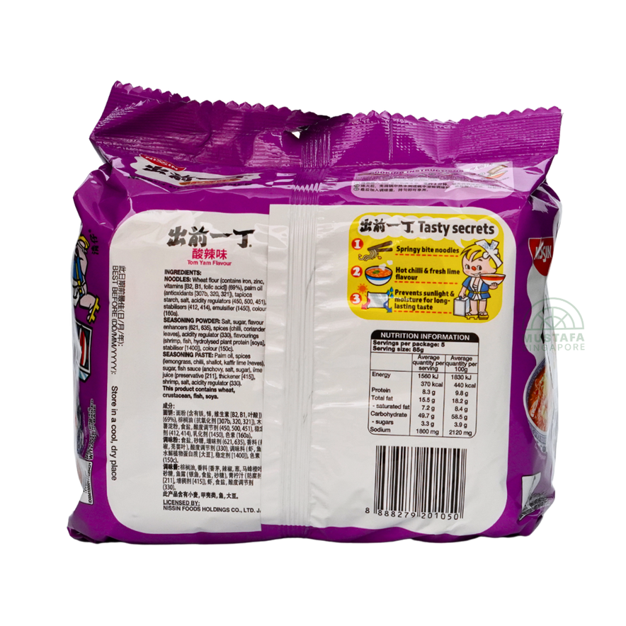 Noodles: Wheat flour (77%), palm oil (with antioxidants E306, E320, E321), salt, acidity regulators (E450, E451, E500, E501), stabilizers (E412, E414), emulsifier (E1450). Seasoning Powder: Salt, sugar, flavor enhancers (E621, E635), spices, acidity regulator (E330), flavoring powder (shrimp, hydrolyzed plant protein [soya], stabilizer E1400), color (E150c), coriander leaf, anti-caking agents (E535, E536). Seasoning Paste: Palm oil, sugar, spices, salt, shrimp, fish sauce, acidity regulator (E330), lemon.