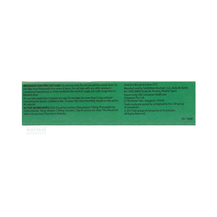 Paracetamol 1000mg, Phenylephrine Hydrochloride 12.2mg, sucrose, citric acid, ascorbic acid (Vitamin C), lemon flavour, and colouring