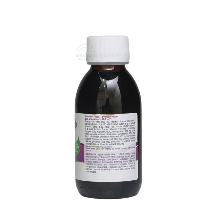 Agave syrup, purified water, acacie fibers, hydroglycerined plants extract (Acerola, Broccoli, Echinacea, Ginseng, Cynnorhodon), Propolis, vegetable glycerin, natural blueberry concentrate, blueberry and raspberry flavour, preservative, potassium sorbate, vitamin C, manganese gluconae, copper gluconate