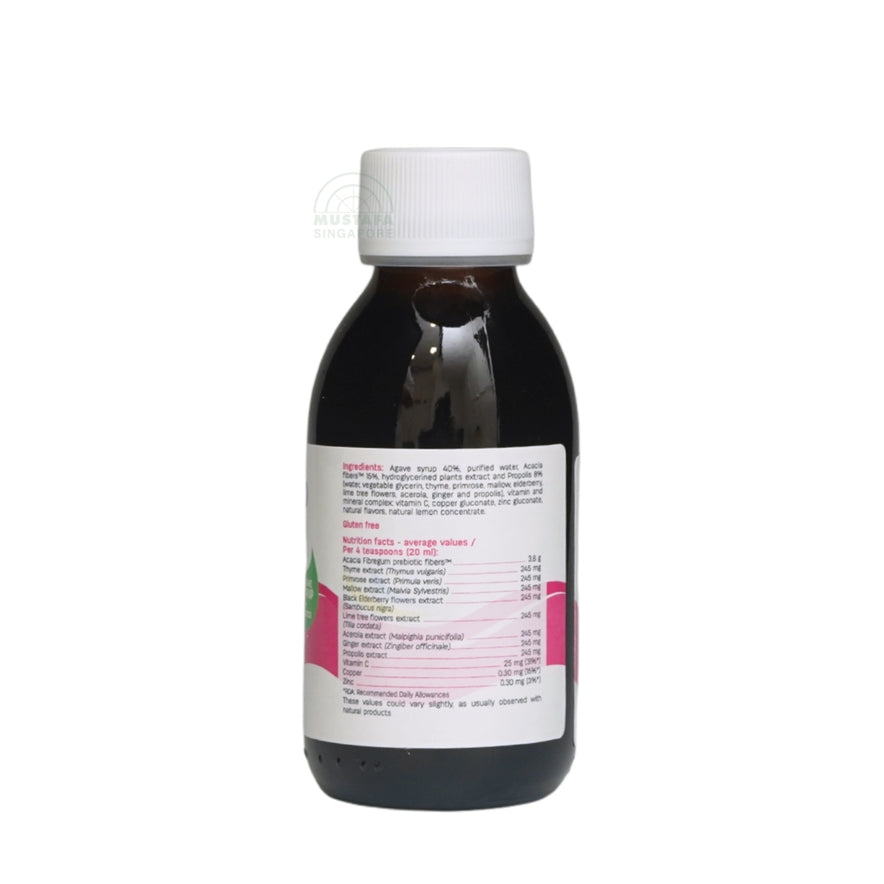 Agave syrup 40%, purified water, acacia fibers 15%, hydroglycerin plant extract and Propolis 8% (water, vegetable glycerin, Thyme, Primrose, Mallow, elderberry and lime blossom, Acerola, Ginger and Propolis), aromas including natural honey aroma, vitamin and mineral complex: Vitamin C, Zinc gluconate, Copper gluconate; acidity regulator: citric acid, preservative: potassium sorbate, natural lemon concentrate.Gluten free