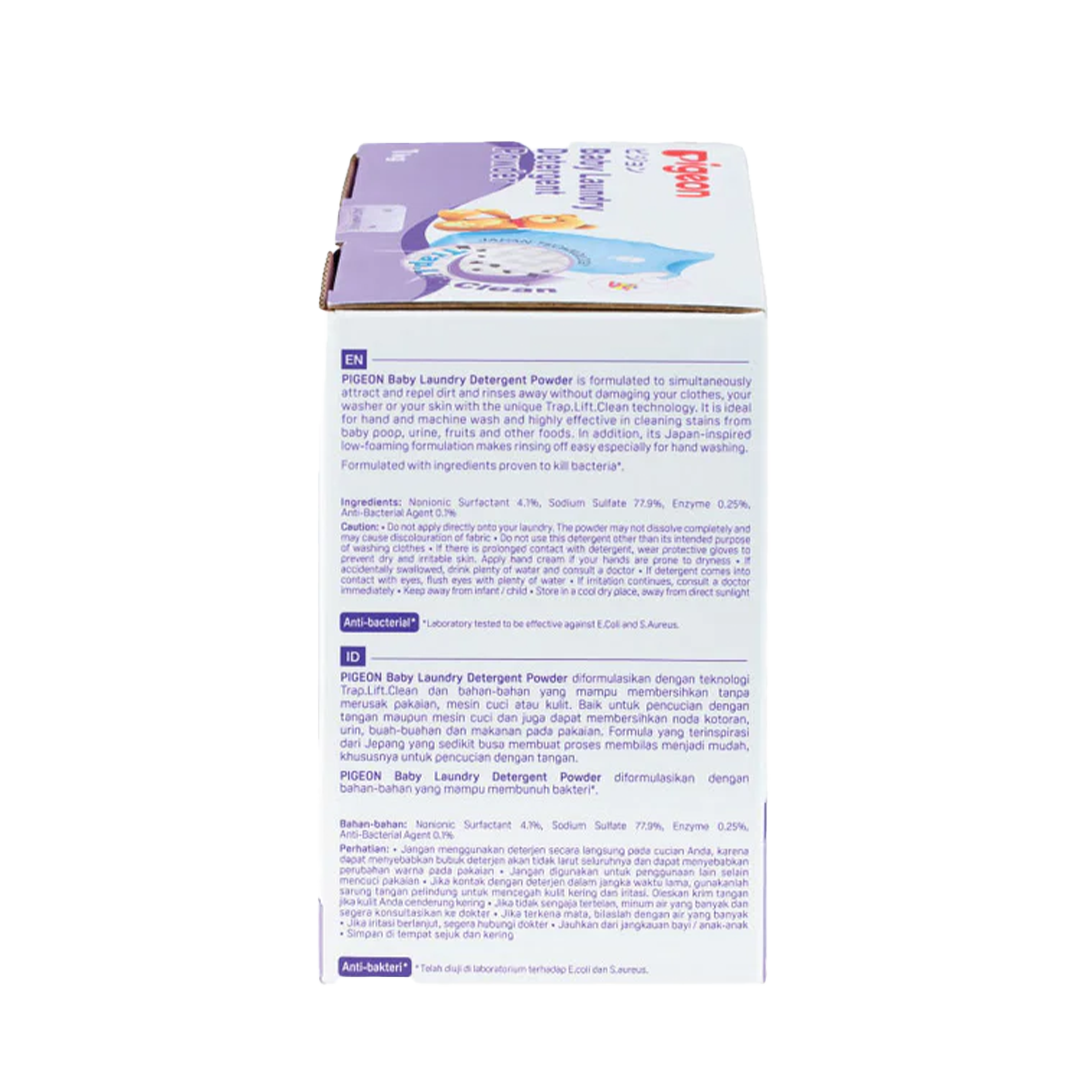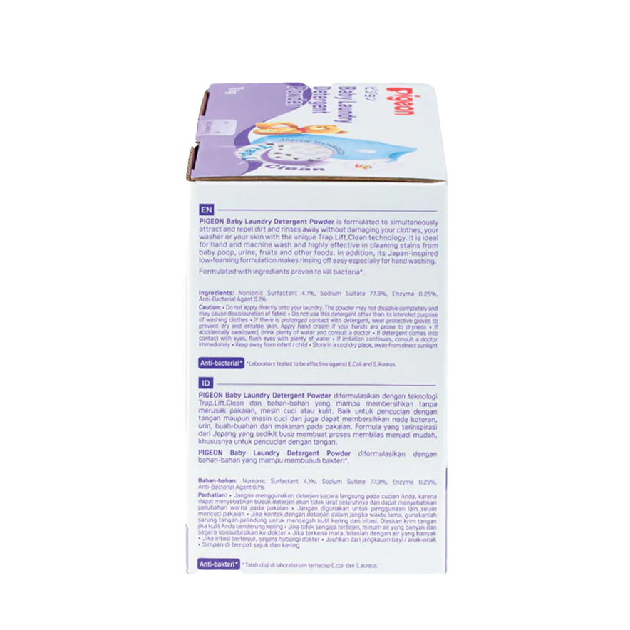 Pigeon Baby Laundry Detergent removes tough stains from baby clothes using plant-based surfactants while being gentle on delicate skin. It rinses easily without residue and leaves a mild, hypoallergenic scent. Suitable for machine and hand washing.
