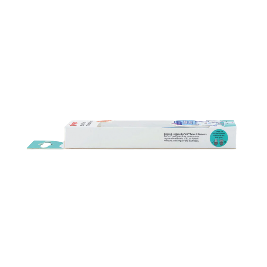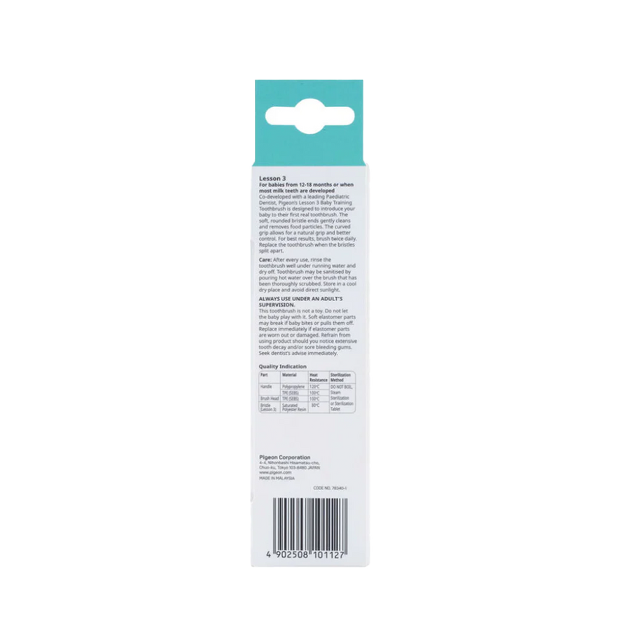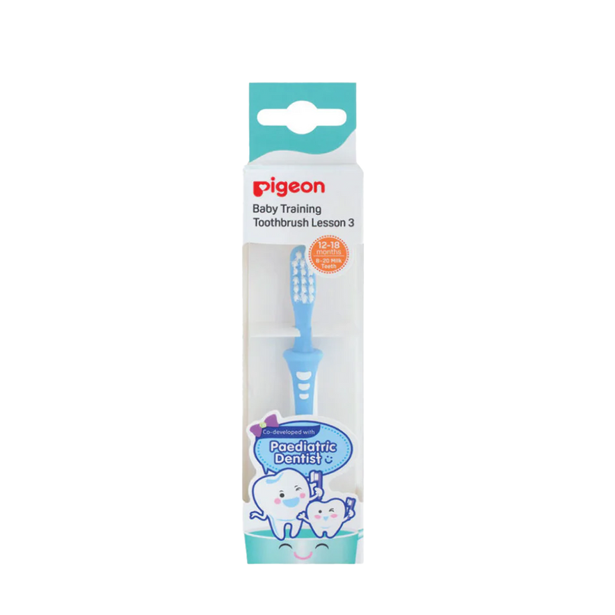 Pigeon Training Toothbrush Lesson 3 helps toddlers aged 12-18 months learn proper brushing. Co-developed with paediatric dentists, its soft rounded bristles and easy-grip handle encourage independent brushing while protecting delicate gums.