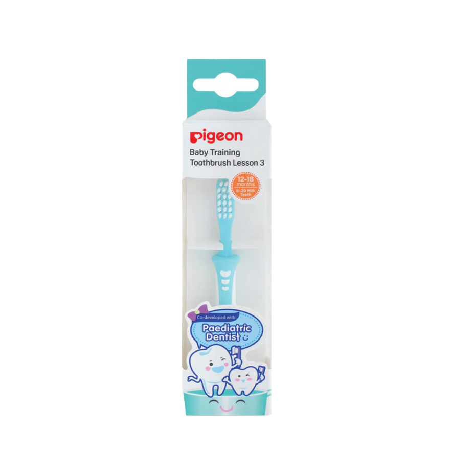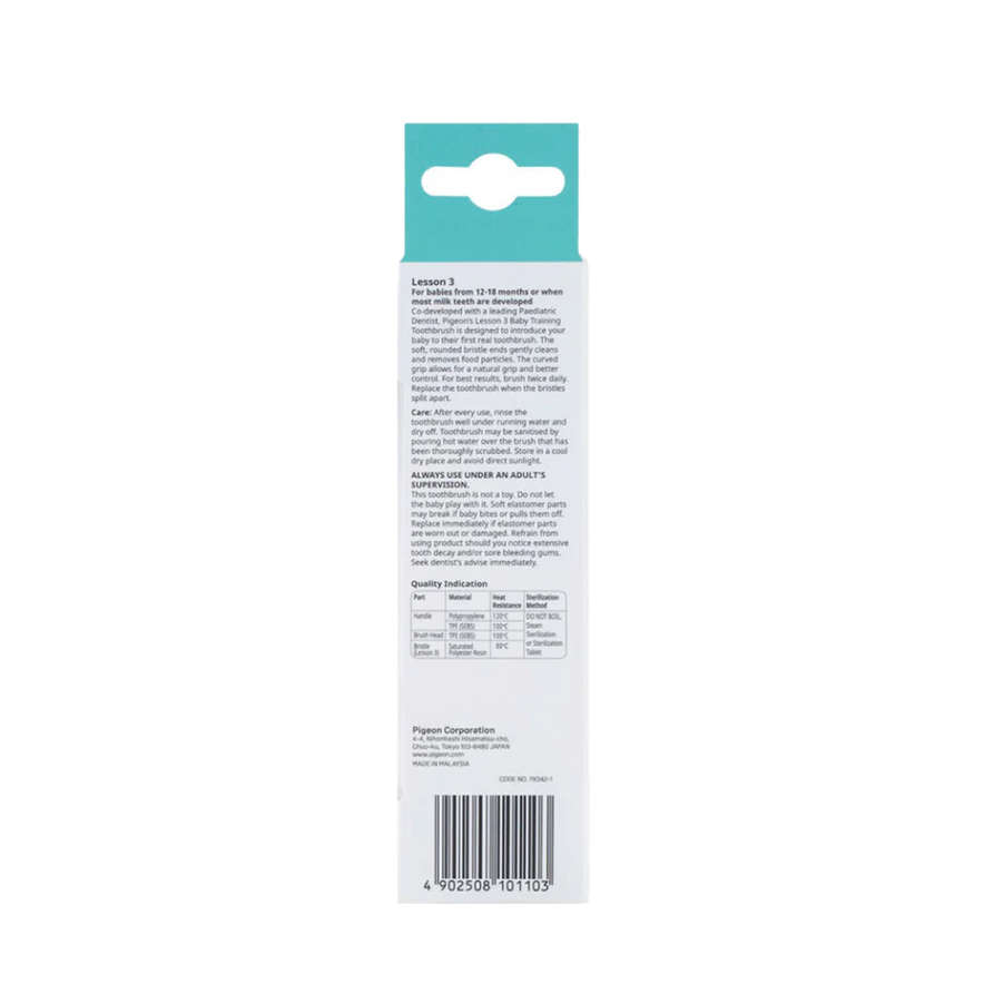 Pigeon Training Toothbrush Lesson 3 helps toddlers aged 12-18 months learn proper brushing. Co-developed with paediatric dentists, its soft rounded bristles and easy-grip handle encourage independent brushing while protecting delicate gums.