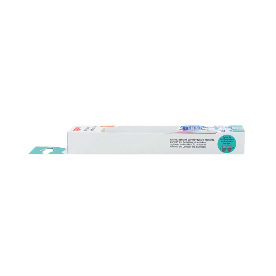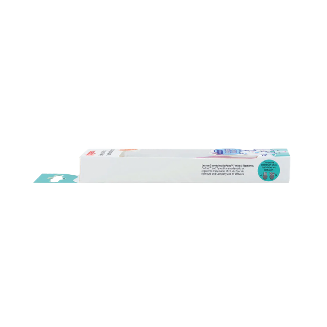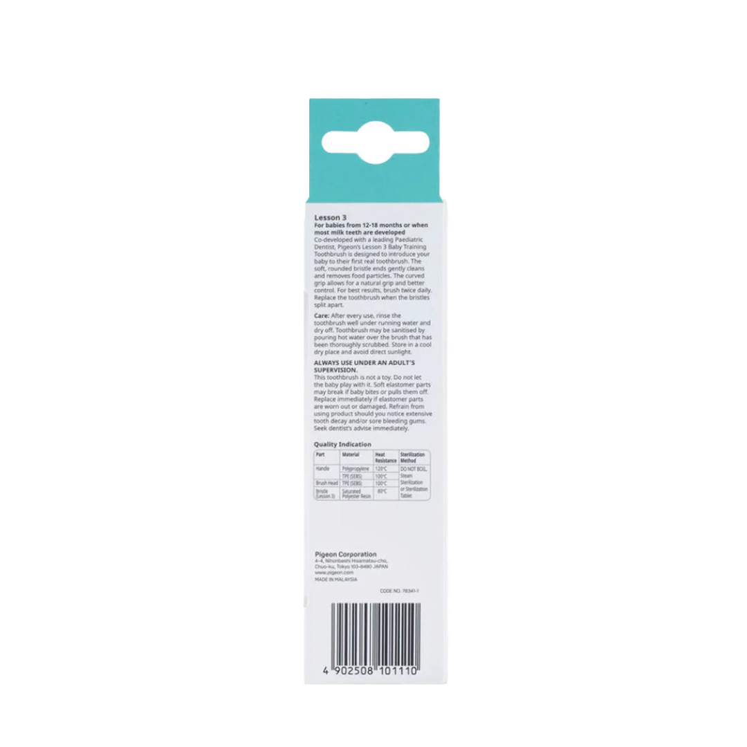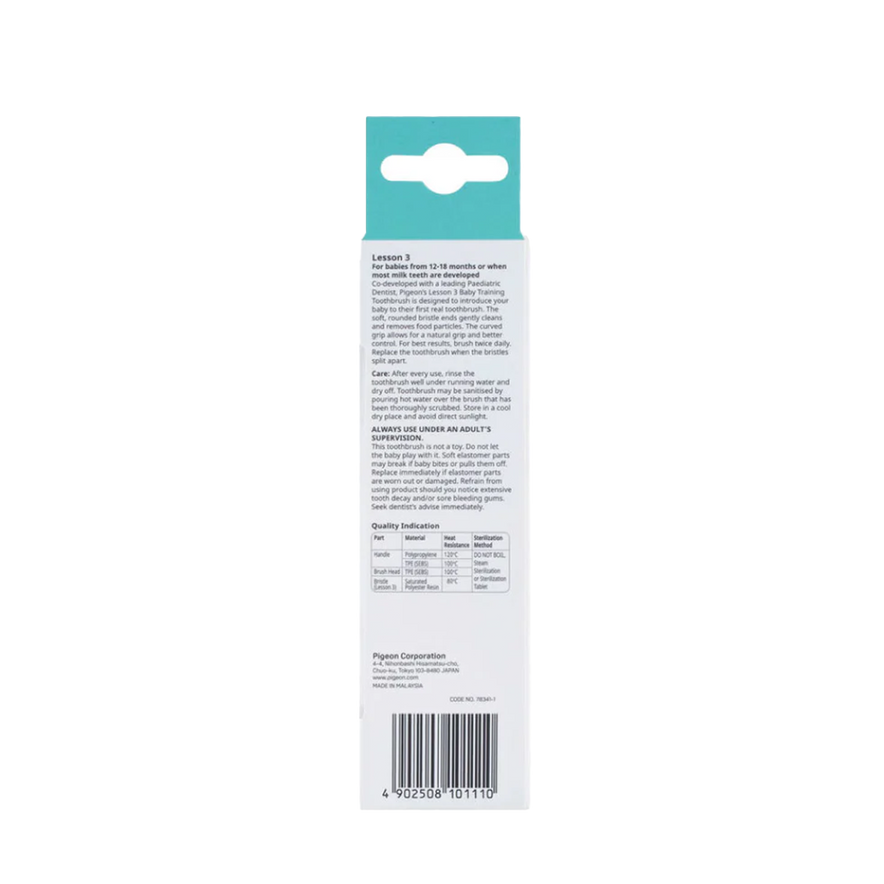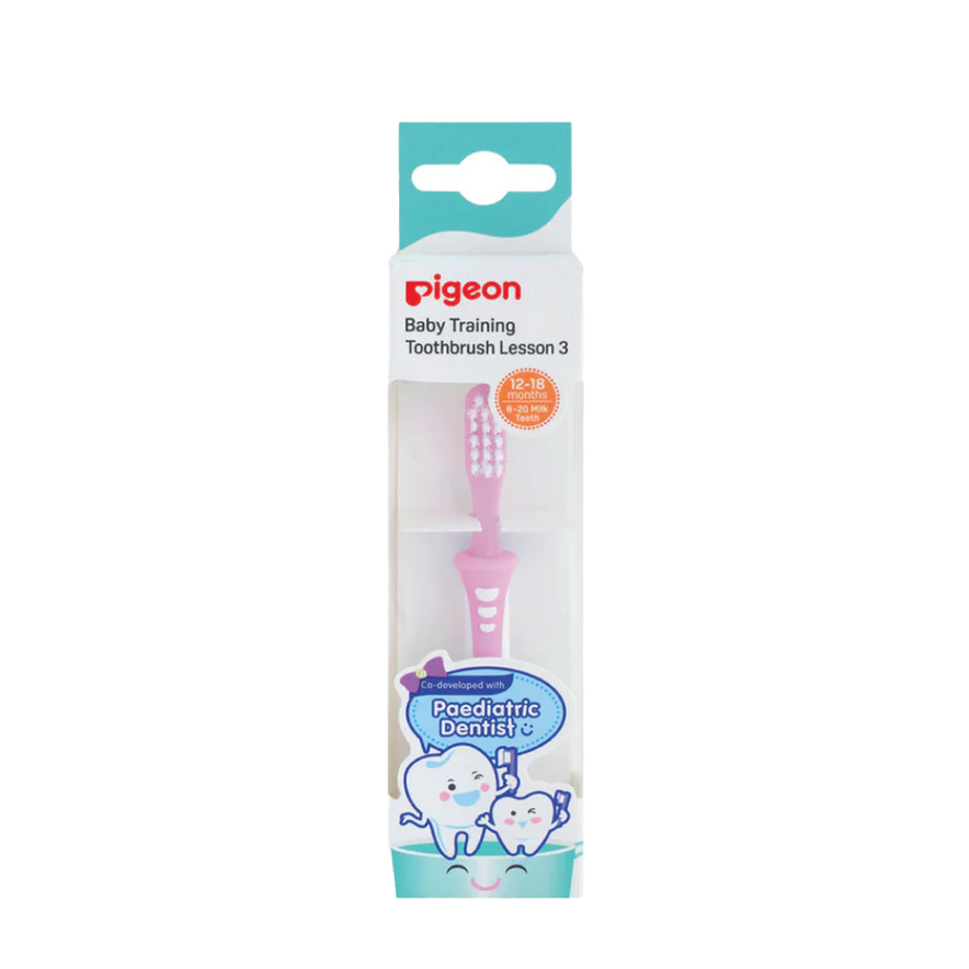 Pigeon Training Toothbrush Lesson 3 helps toddlers aged 12-18 months learn proper brushing. Co-developed with paediatric dentists, its soft rounded bristles and easy-grip handle encourage independent brushing while protecting delicate gums.
