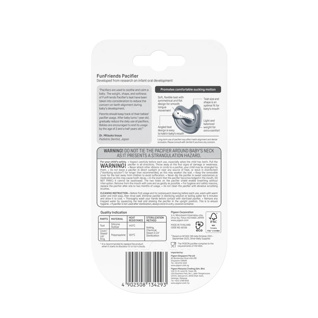 Soothe your baby with the Pigeon pacifier. The orthodontic silicone teat supports healthy oral development and ventilation holes reduce skin irritation. Fun character designs make comfort time cheerful. Choose the size that suits your baby's age.