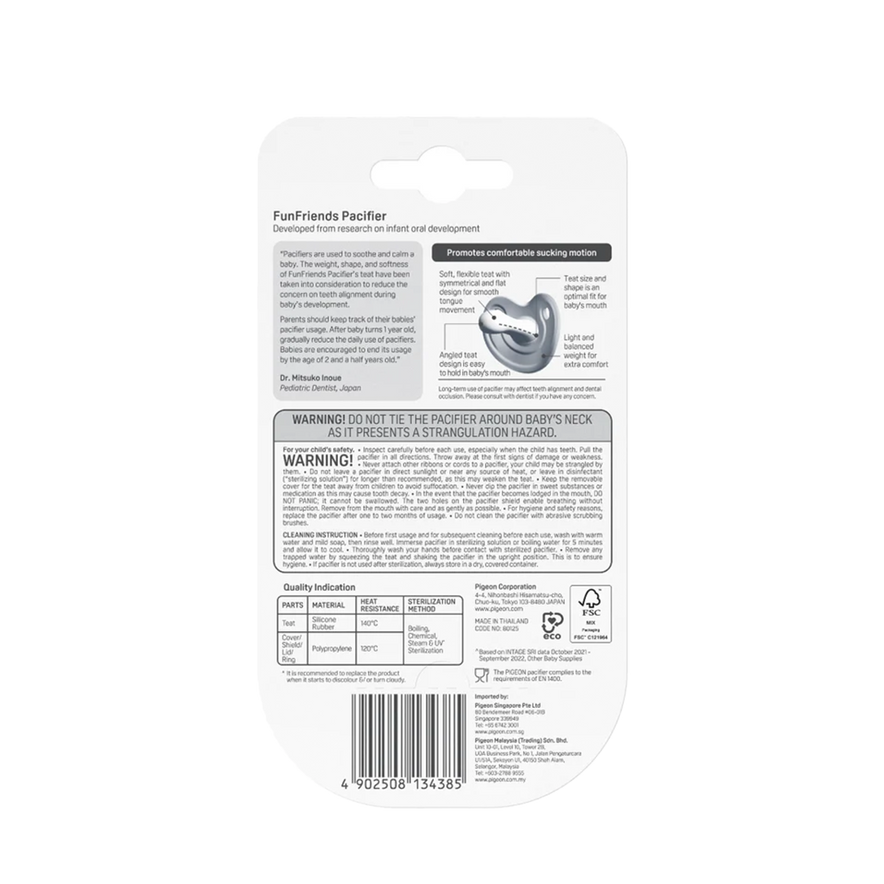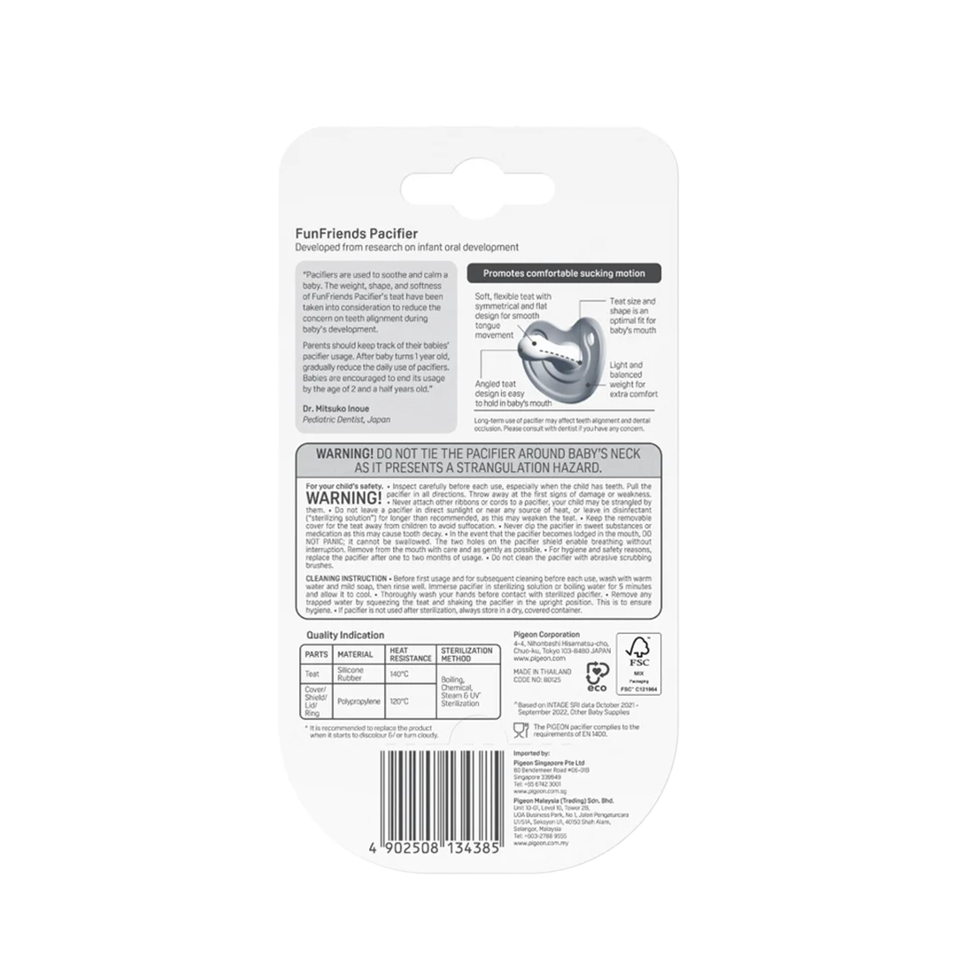 Soothe your baby with the Pigeon pacifier. The orthodontic silicone teat supports healthy oral development and ventilation holes reduce skin irritation. Fun character designs make comfort time cheerful. Choose the size that suits your baby's age.
