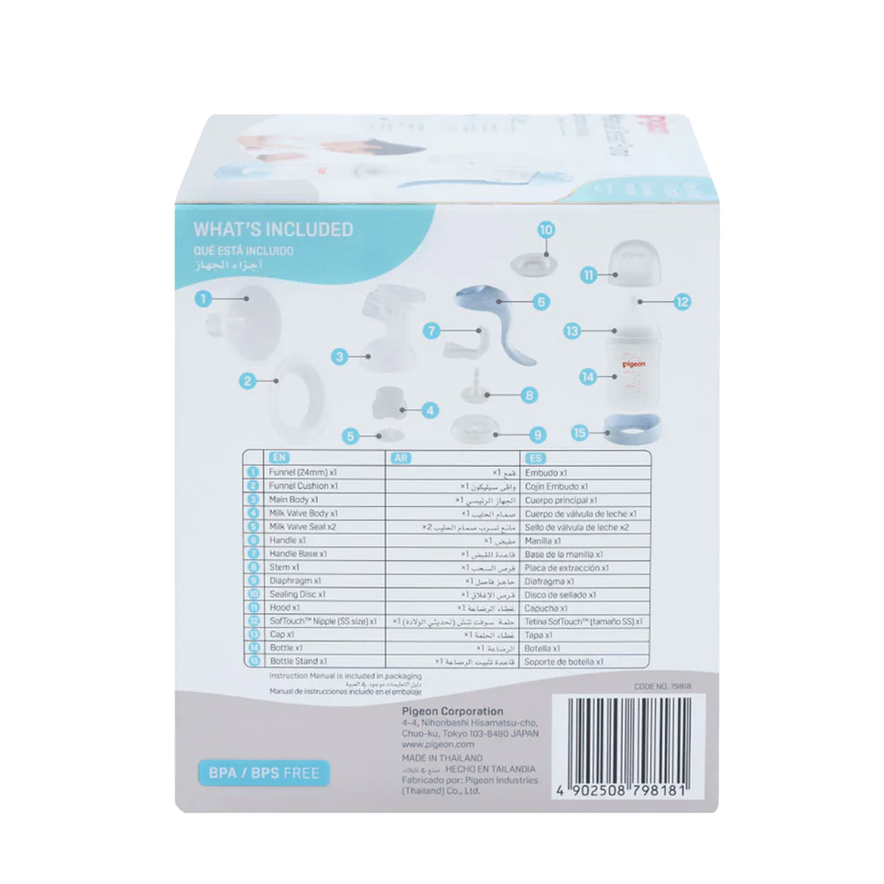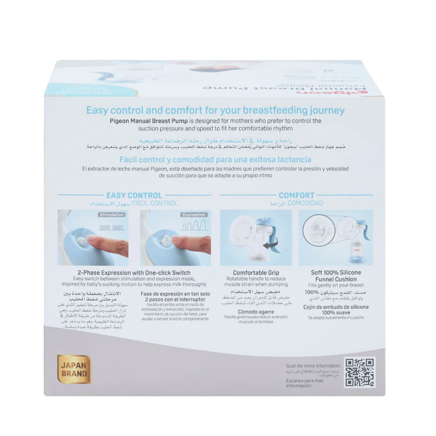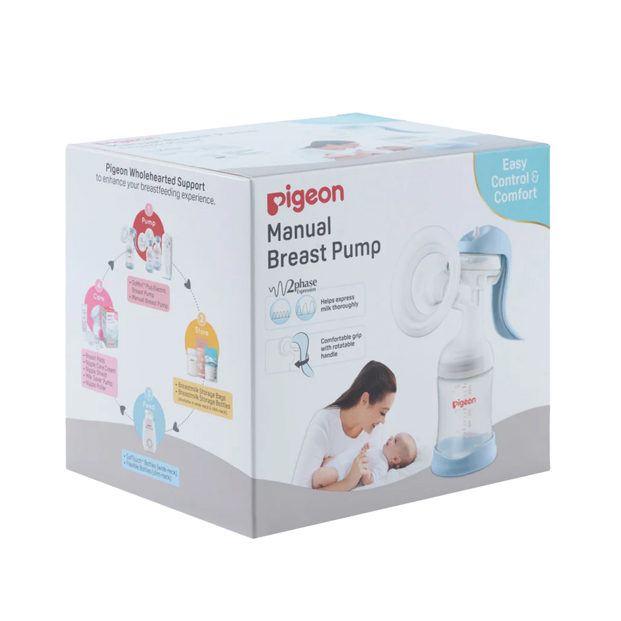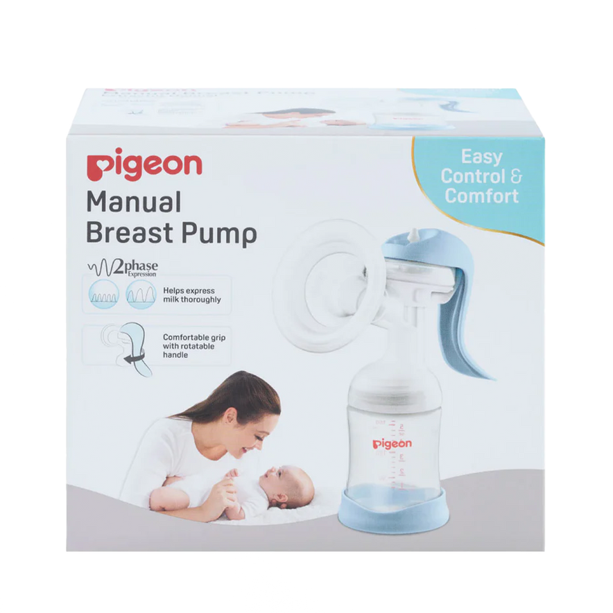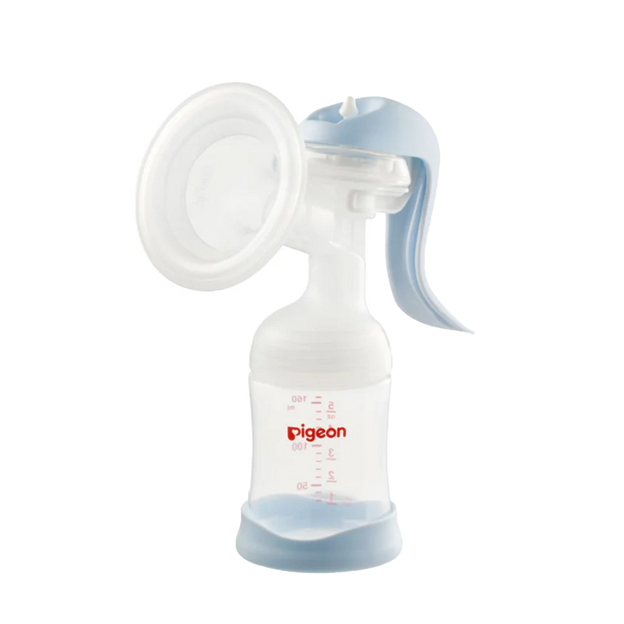 The Pigeon manual breast pump offers gentle yet efficient milk expression. Its ergonomic handle lets you control suction while the soft funnel cushions the breast for comfort. Compact and quiet for discreet pumping.