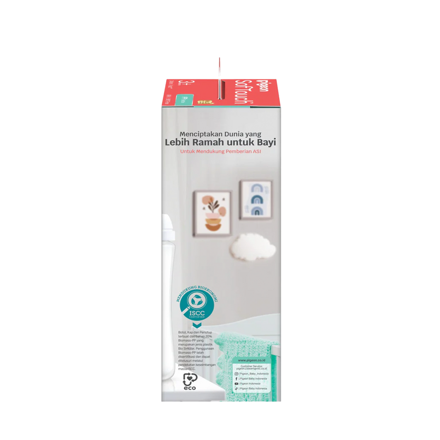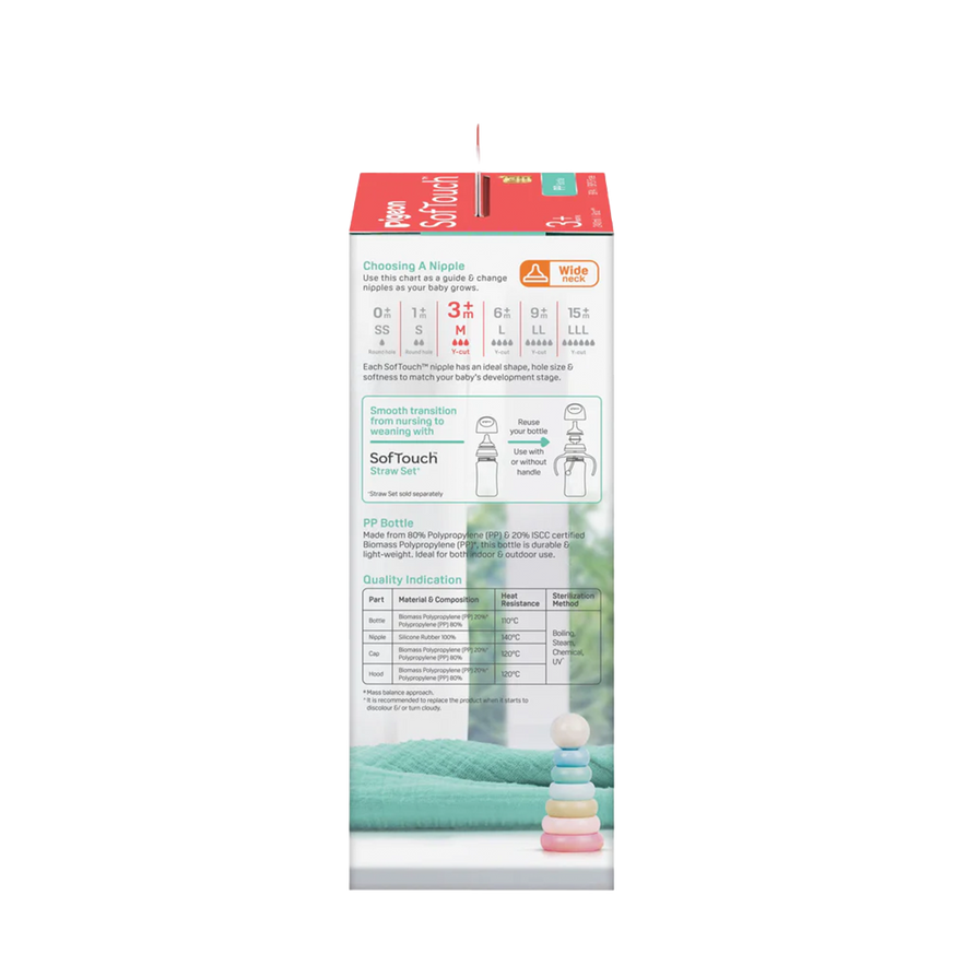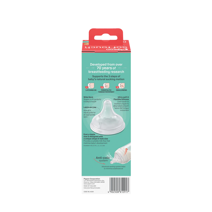 The Pigeon SofTouch nursing bottle features a wide-neck design and peristaltic nipple that mimics breastfeeding for a smooth latch. The high-quality PP body is lightweight yet durable, and the air ventilation system helps reduce colic for comfortable feeding.