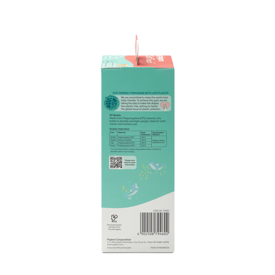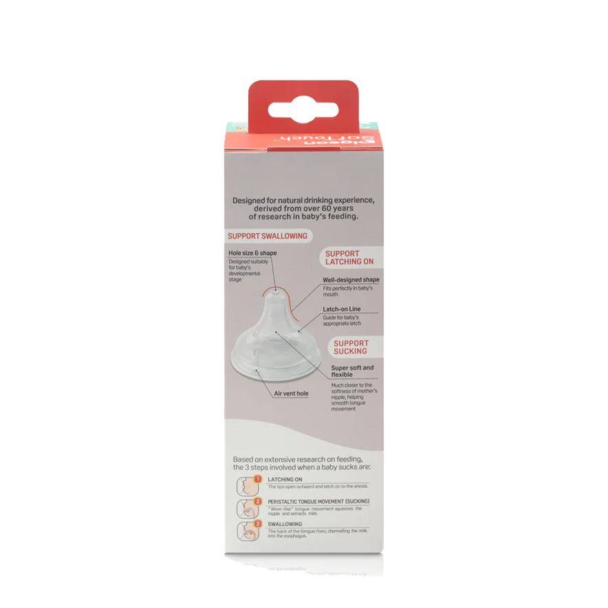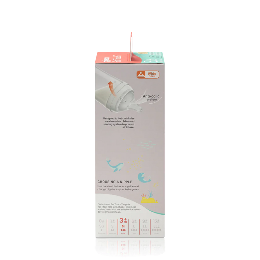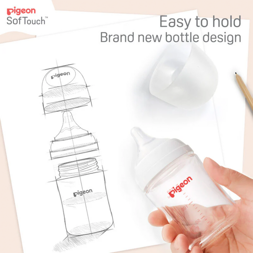 The Pigeon SofTouch nursing bottle features a wide-neck design and peristaltic nipple that mimics breastfeeding for a smooth latch. The high-quality PP body is lightweight yet durable, and the air ventilation system helps reduce colic for comfortable feeding.