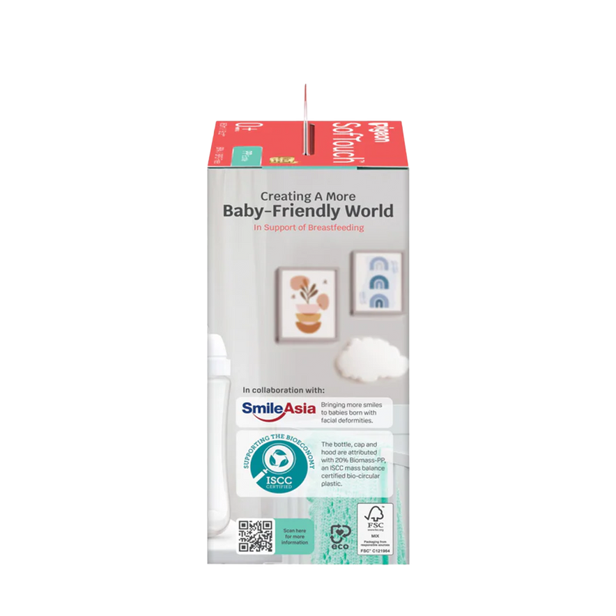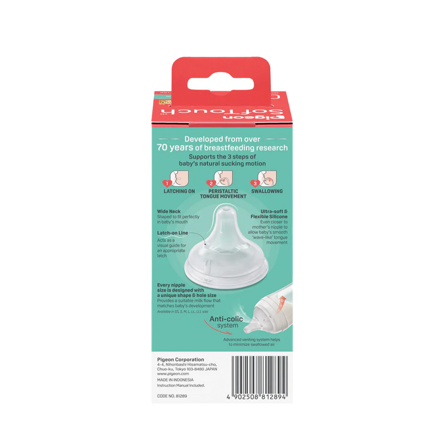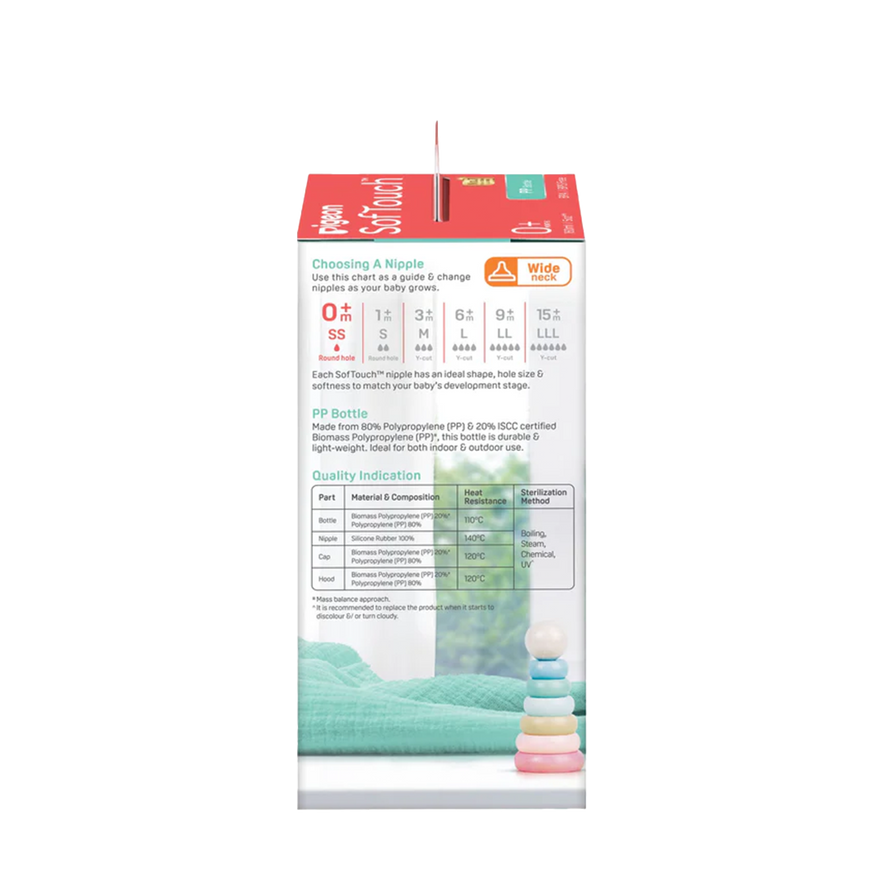 The Pigeon SofTouch nursing bottle features a wide-neck design and peristaltic nipple that mimics breastfeeding for a smooth latch. The high-quality PP body is lightweight yet durable, and the air ventilation system helps reduce colic for comfortable feeding.