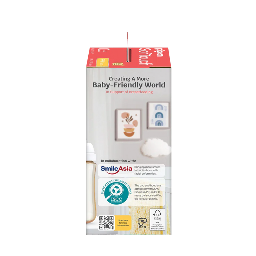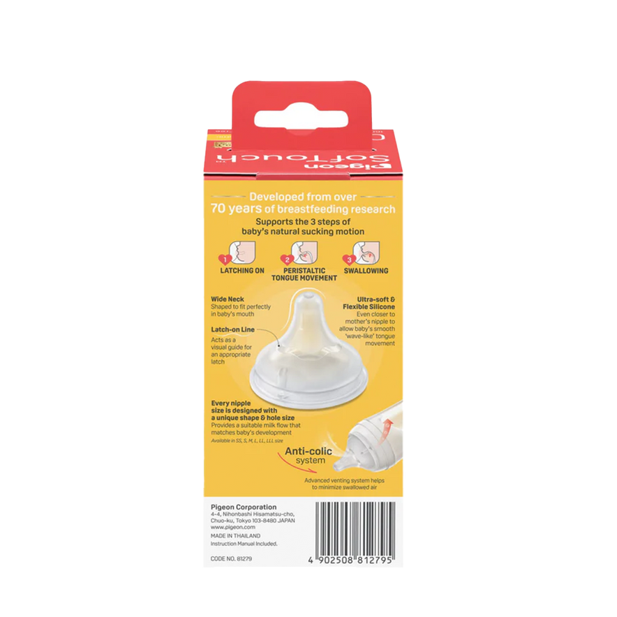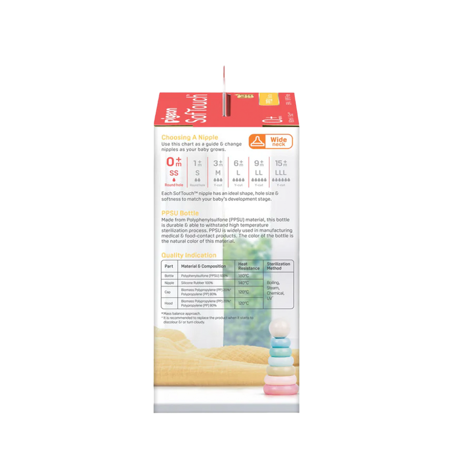 The Pigeon SofTouch nursing bottle features a wide-neck design and peristaltic nipple that mimics breastfeeding for a smooth latch. The medical-grade PPSU body is lightweight yet durable, and the air ventilation system helps reduce colic for comfortable feeding.