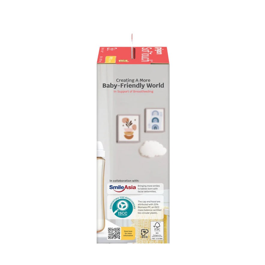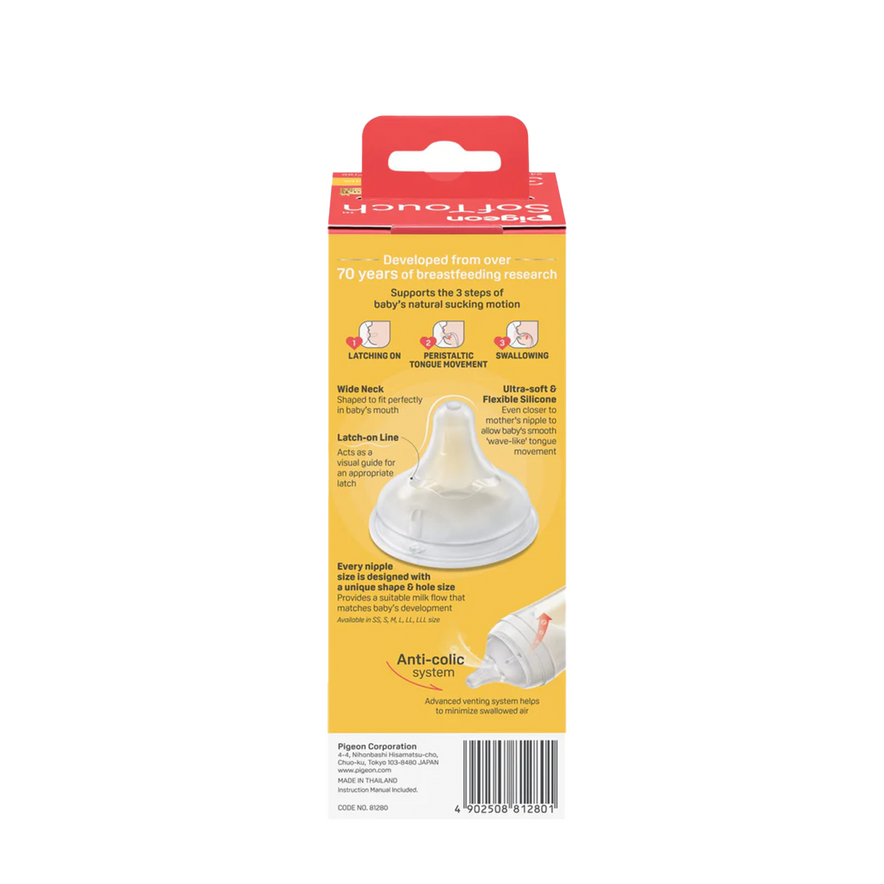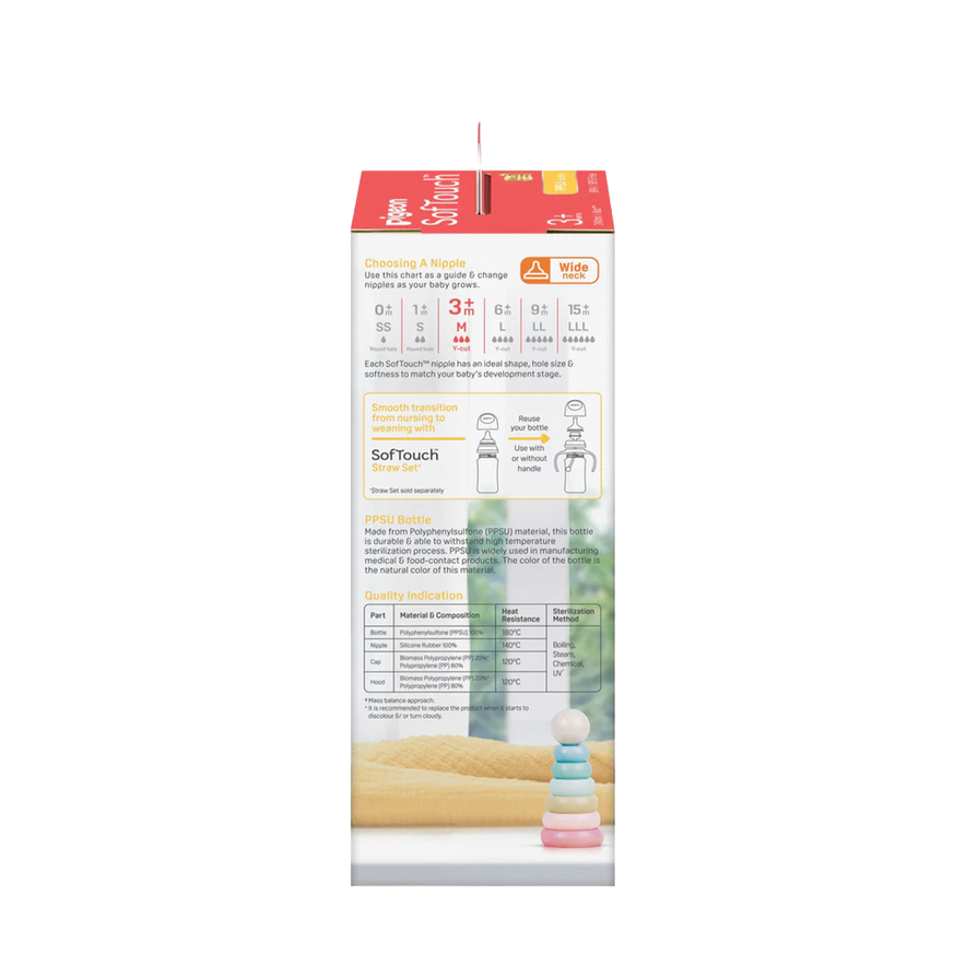 The Pigeon SofTouch nursing bottle features a wide-neck design and peristaltic nipple that mimics breastfeeding for a smooth latch. The medical-grade PPSU body is lightweight yet durable, and the air ventilation system helps reduce colic for comfortable feeding.