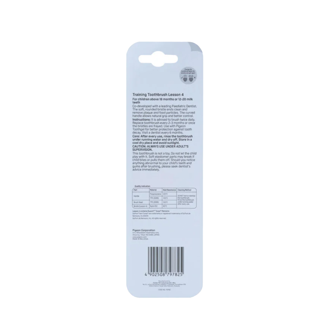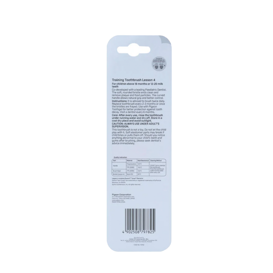 Pigeon Training Toothbrush Lesson 4 is designed for toddlers 18 months and up to practise mature brushing techniques. Its tapered bristles clean thoroughly while the ergonomic handle fits little hands for confident brushing.
