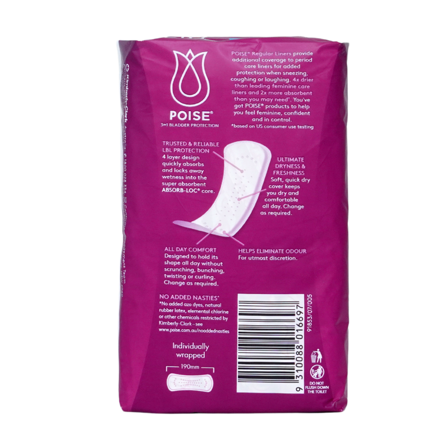 Poise Liners Regular 19cm 26s are designed for light bladder leaks, offering discreet and comfortable everyday protection. With a slim 19cm length, these liners provide freshness, absorbency, and flexibility for active lifestyles.