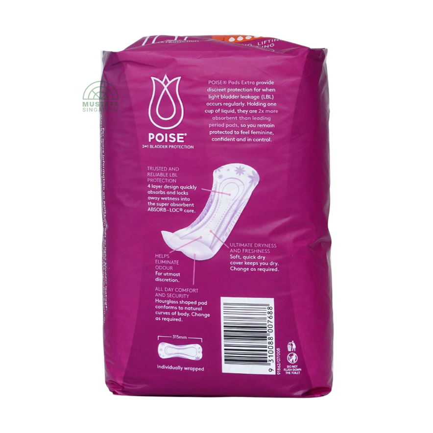Poise Pad Extra 31.5cm 12s offers long, secure coverage for moderate to heavy bladder leaks. At 31.5cm, these pads ensure superior absorbency and protection during day or night use.