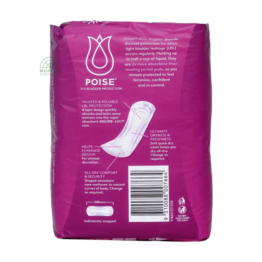Poise Pad Regular 24.8cm 16s delivers reliable absorbency for light to moderate bladder leaks. With a 24.8cm design, these pads offer more coverage than liners, keeping you dry and confident throughout the day.