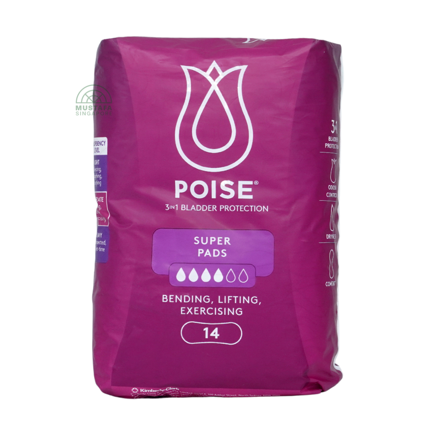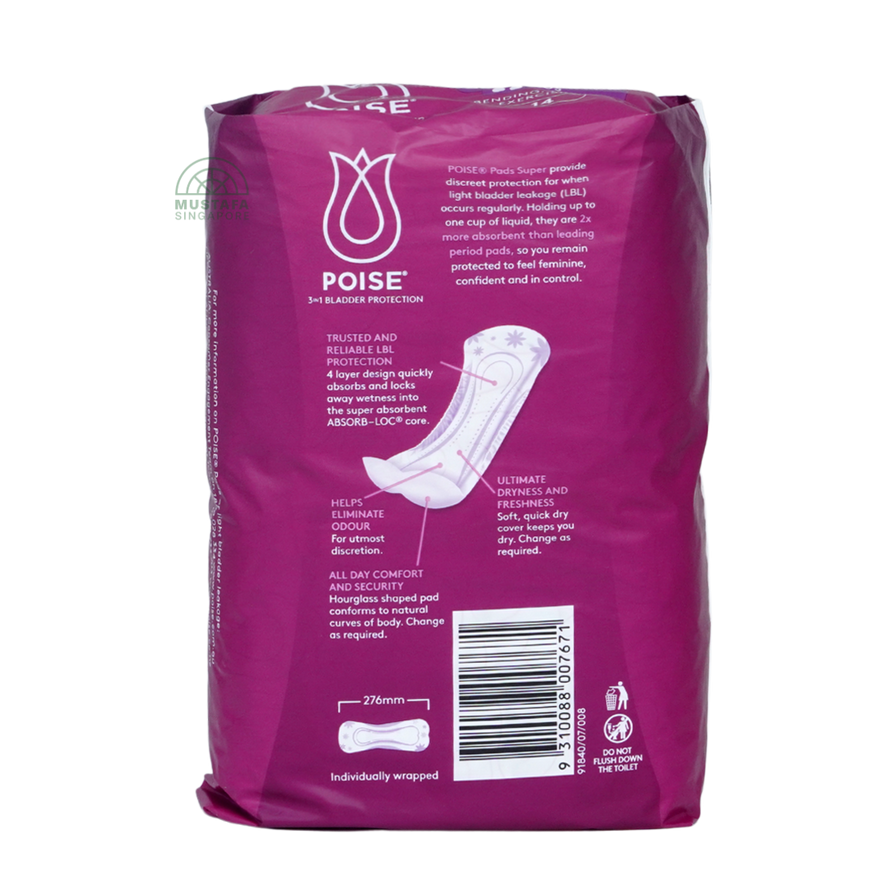 Poise Pad Super 27.6cm 14s provides strong absorbency with medium length coverage, perfect for moderate to heavy bladder leaks. Discreet yet effective, these pads ensure dryness and comfort.