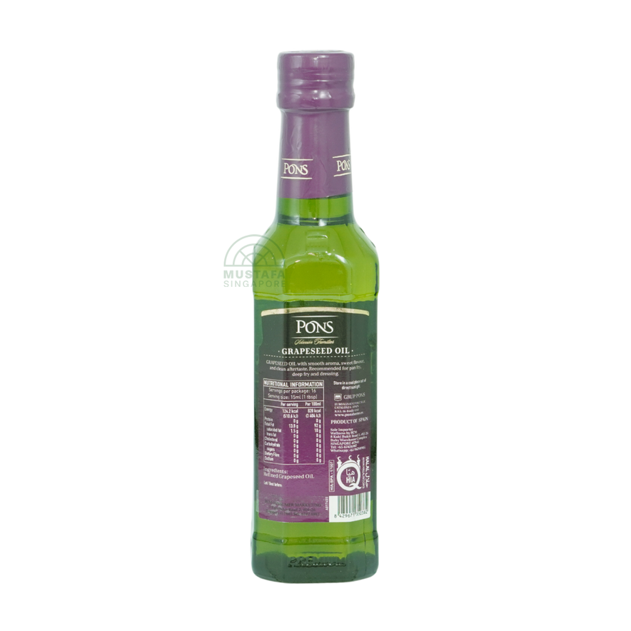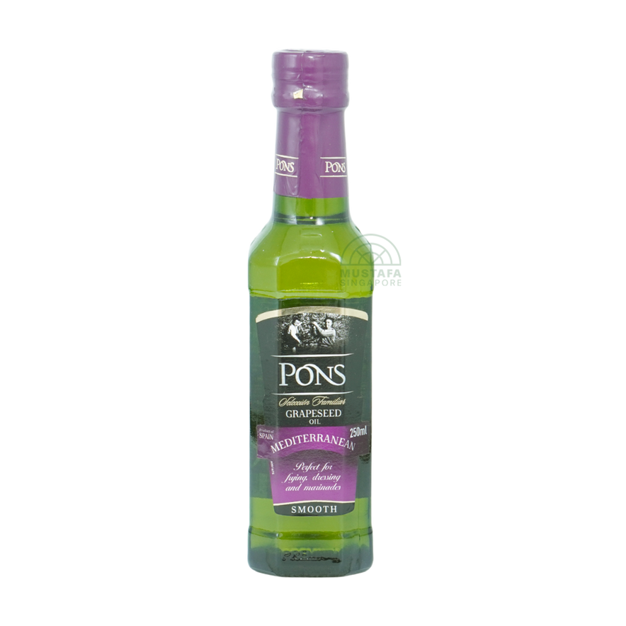 Pons Grapeseed Oil Mediterranean (250ml) is a light, neutral oil extracted from premium Mediterranean grape seeds. With its high smoke point and delicate flavour, it's ideal for sautéing, deep-frying, and baking, while also being a healthy choice for salad dressings and marinades.