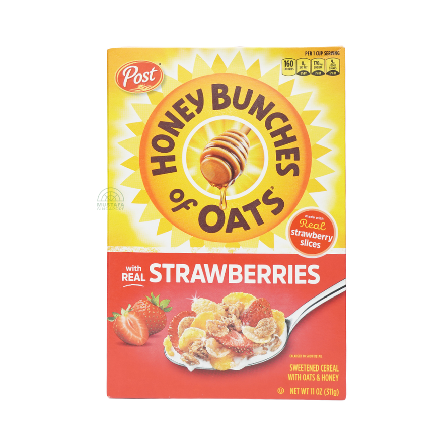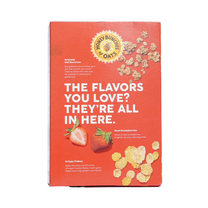 Post Honey Bunches of Oats Strawberry blends crispy flakes, crunchy oat clusters, and real strawberry pieces for a fruity, sweet crunch. Perfect for a quick, nutritious breakfast.
