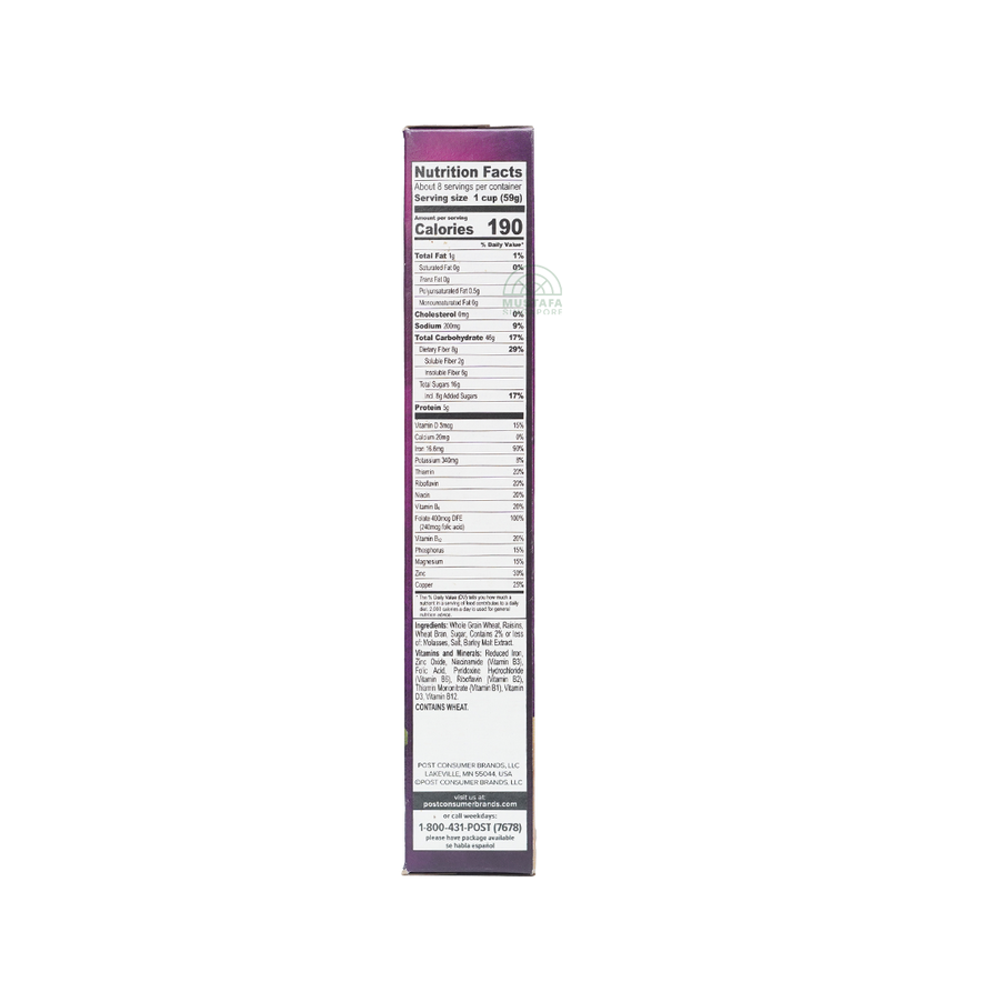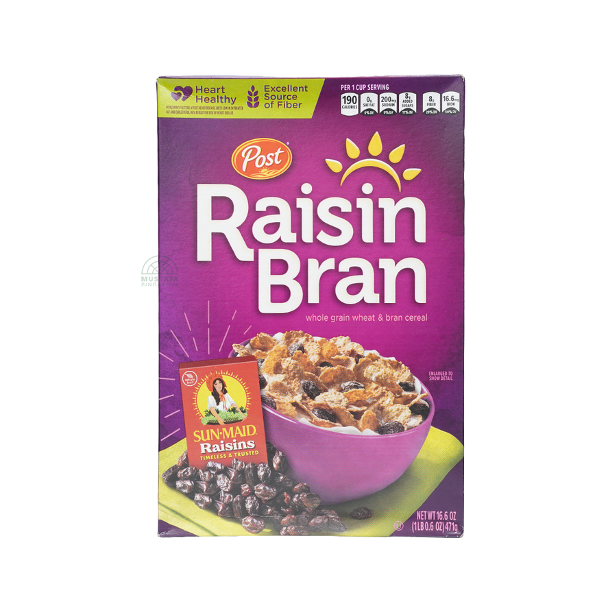 Post Raisin Bran is a wholesome breakfast cereal made with whole grain wheat flakes and naturally sweet, juicy raisins. It provides a hearty, nutritious start to the day with a balanced source of fiber, vitamins, and minerals, making it perfect for a healthy and satisfying breakfast.
