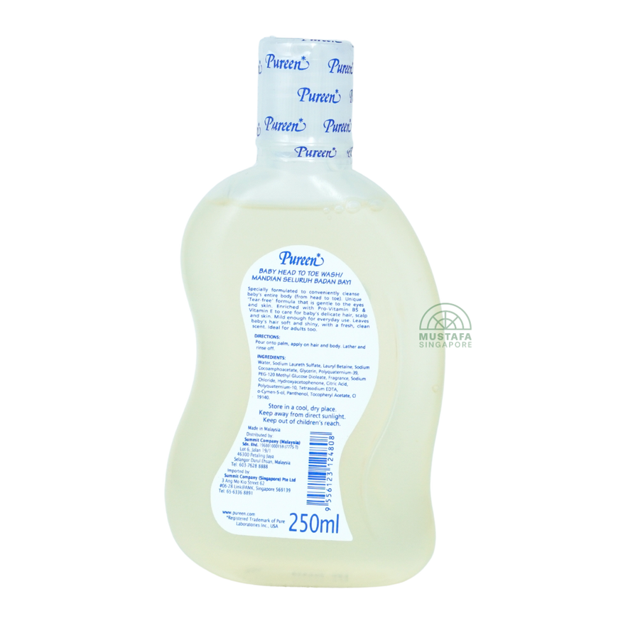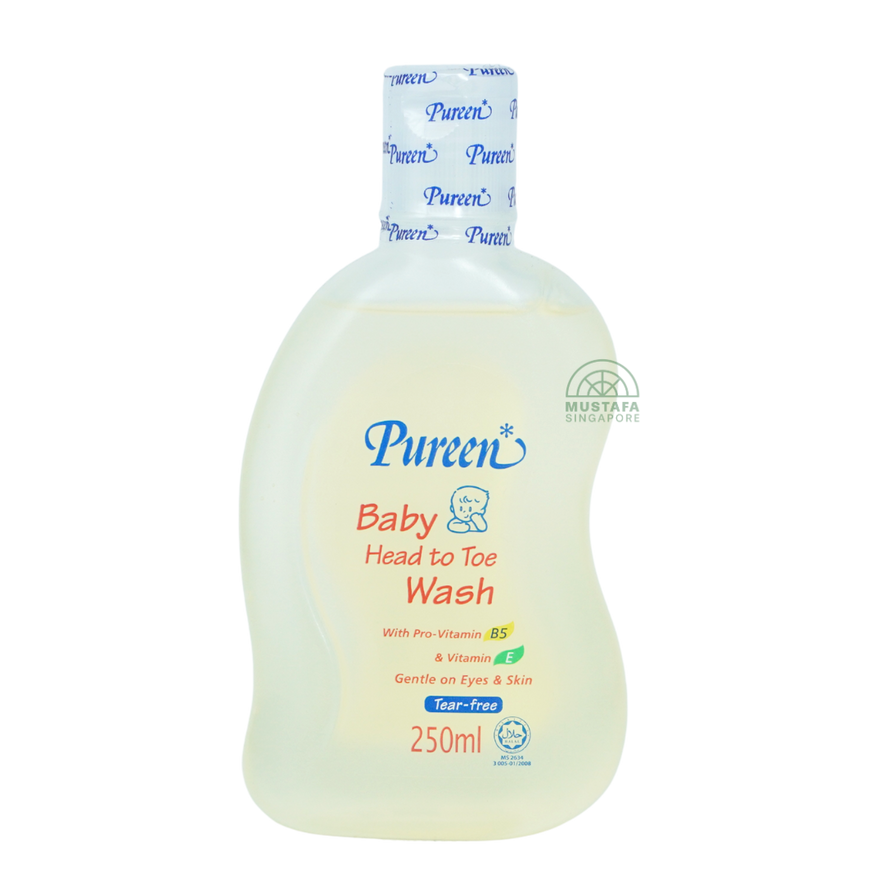 Pureen Baby Head to Toe Wash 250ml is specially formulated to gently cleanse baby's entire body from head to toe. Its unique tear free formula is mild on baby's eyes and skin, enriched with Pro Vitamin B5 and Vitamin E to nourish delicate hair, scalp, and skin. Safe for everyday use, this wash leaves hair soft, shiny, and easy to manage while giving skin a fresh, clean scent after every bath.