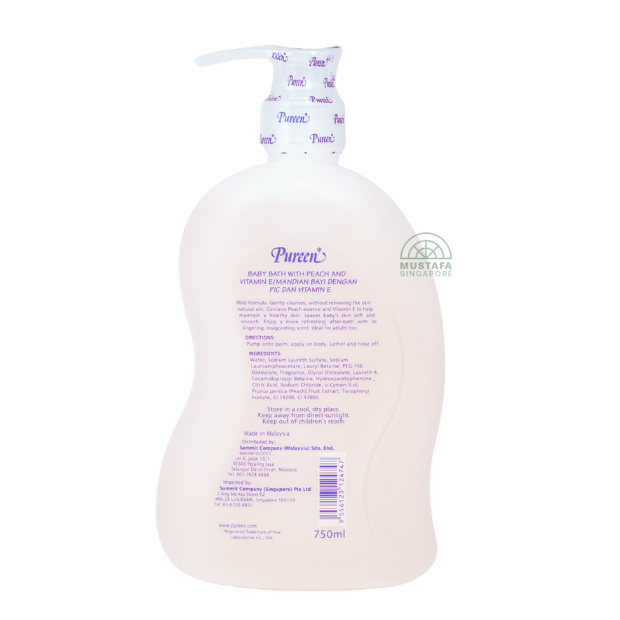 Pureen Baby Bath Peach and Vitamin E 750ml is a mild and gentle baby wash formulated for daily use. Enriched with peach essence and Vitamin E, it helps nourish and maintain healthy skin while keeping it soft and smooth. Its creamy, foamy lather cleanses effectively, leaving behind a refreshing and invigorating scent that makes bath time enjoyable. Safe and dermatologically tested, this baby bath is suitable for delicate baby skin and family use.
