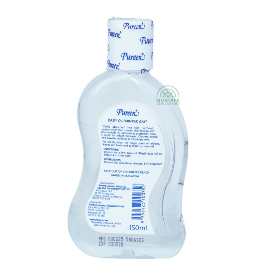 Pureen Baby Oil 150ml is a pure and lightweight oil that absorbs easily into the skin without leaving a greasy after feel. It helps keep skin soft and smooth, making it ideal for infant massage. It can also be used to clean cream and powder residues in the nappy area. For adults, it is suitable for dry rough spots on elbows, knees, and heels, and can also be used as a gentle make up remover.