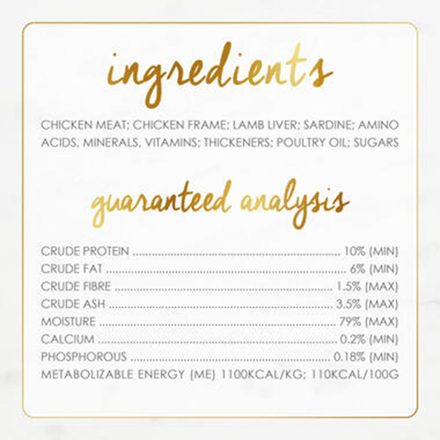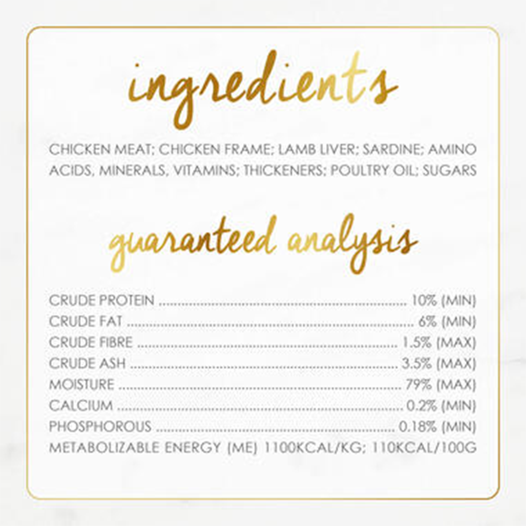 Chicken, liver, meat by-products, fish, artificial and natural flavours, tricalcium phosphate, guar gum, potassium chloride, salt, taurine, minerals (zinc sulfate, ferrous sulfate, copper sulfate, manganese sulfate, potassium iodide), vitamins (vitamin E supplement, niacin, thiamine mononitrate, vitamin A supplement, calcium pantothenate, riboflavin supplement, pyridoxine hydrochloride, folic acid, vitamin D3 supplement, biotin, vitamin B12 supplement, menadione sodium bisulfite complex).