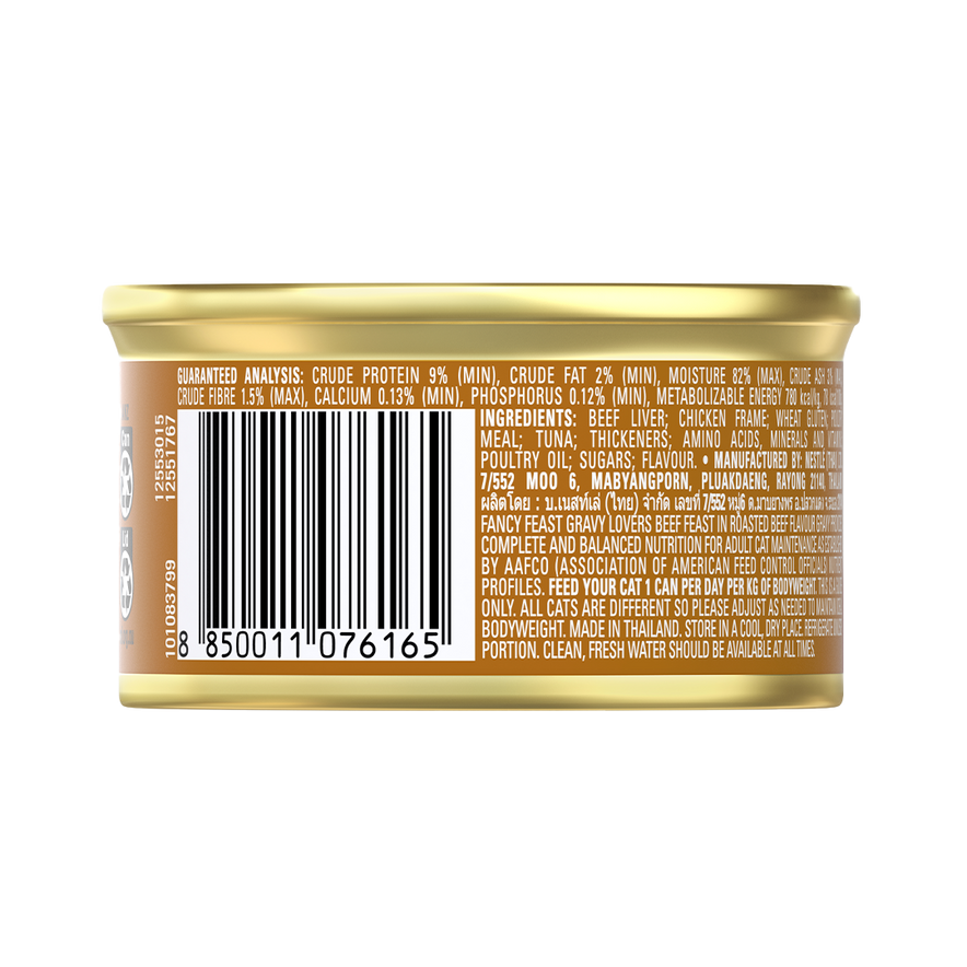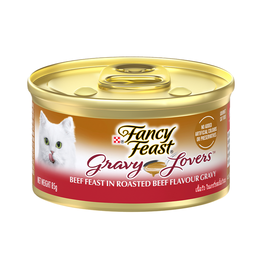 Purina Fancy Feast Gravy Lovers Beef features tender beef in a flavour-rich gravy, creating a gourmet meal that provides complete and balanced nutrition for adult cats.