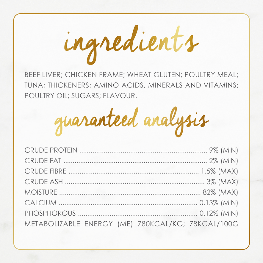 Beef, liver, meat by-products, wheat gluten, water sufficient for processing, artificial and natural flavours, corn starch-modified, salt, added colour, guar gum, taurine, vitamins and minerals.