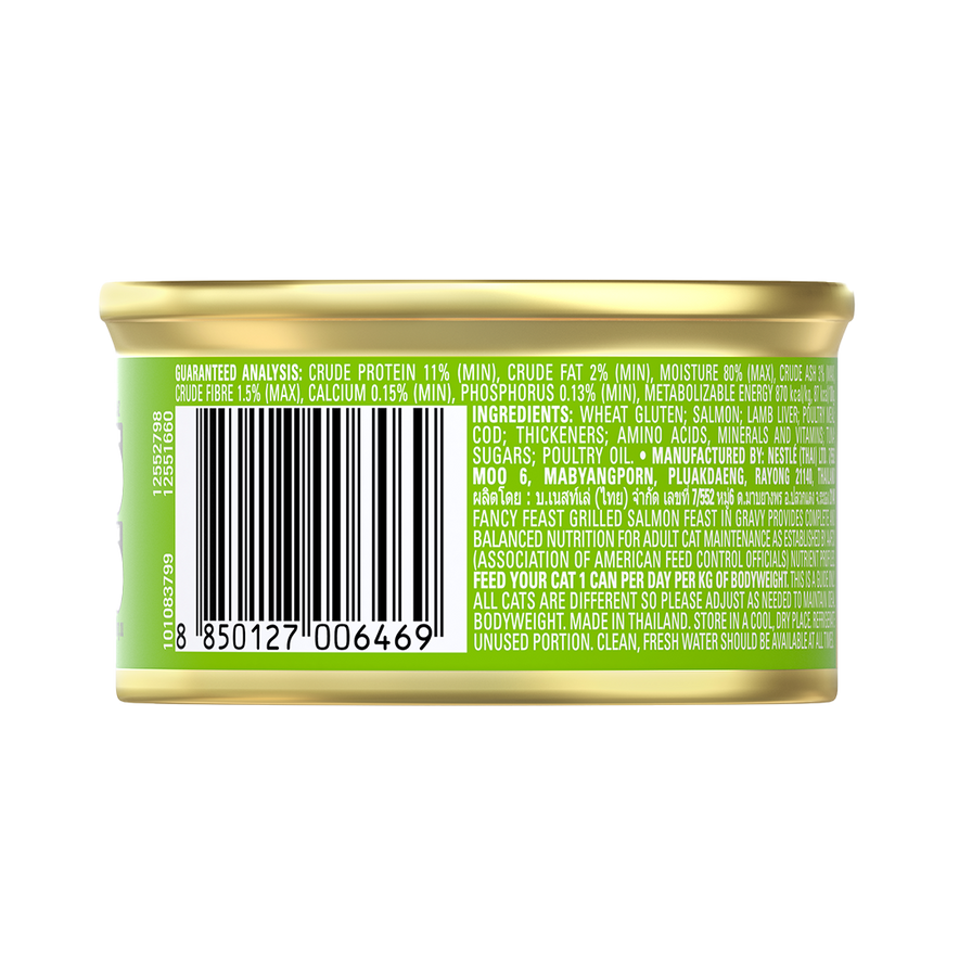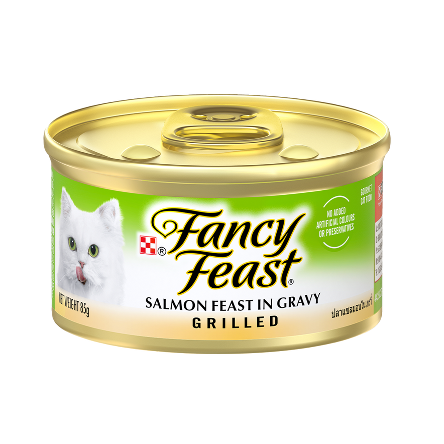 Purina Fancy Feast Grilled Salmon is made with grilled salmon in a savoury gravy for a flavourful gourmet meal, providing essential nutrients and complete nutrition for adult cats.