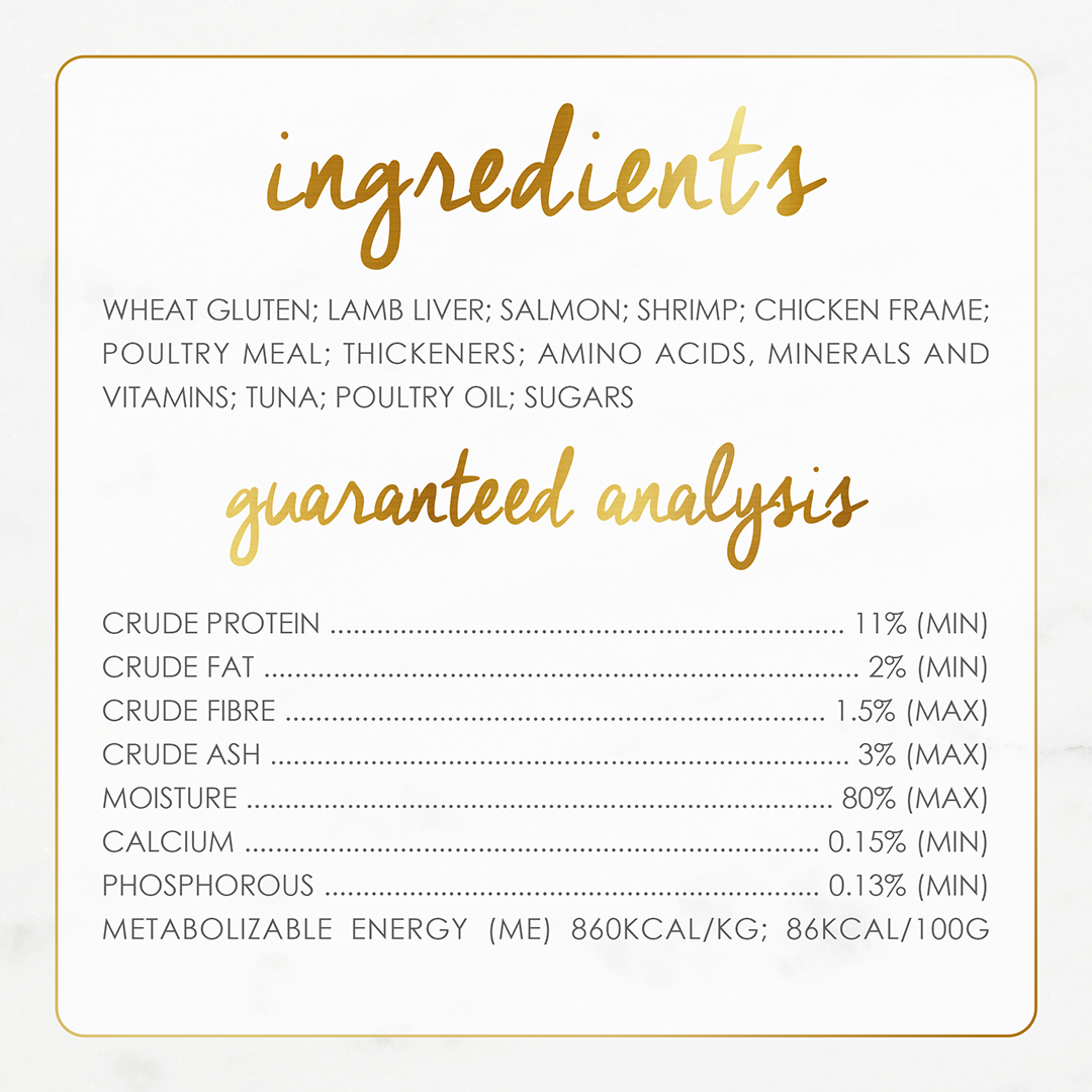 Salmon, liver, meat by-products, wheat gluten, water sufficient for processing, artificial and natural flavours, corn starch-modified, salt, tricalcium phosphate, added colour, guar gum, potassium chloride, taurine, vitamins and minerals.