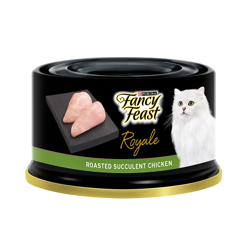 Purina Fancy Feast Royale Roasted Succulent Chicken is a luxurious wet cat food made with roasted chicken in a delicate broth, offering a refined texture and rich flavour. It provides high-quality protein in a premium gourmet meal.