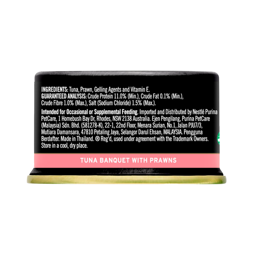Purina Fancy Feast Royale Tuna Banquet with Prawns combines succulent tuna flakes with tender prawn pieces in a delicate broth, creating a premium gourmet meal for cats with refined tastes.