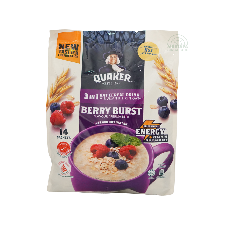Quaker 3 in 1 Oat Cereal Drink Berry Burst 28g x 14s combines oats with fruity berry flavour for a convenient nutritious beverage.