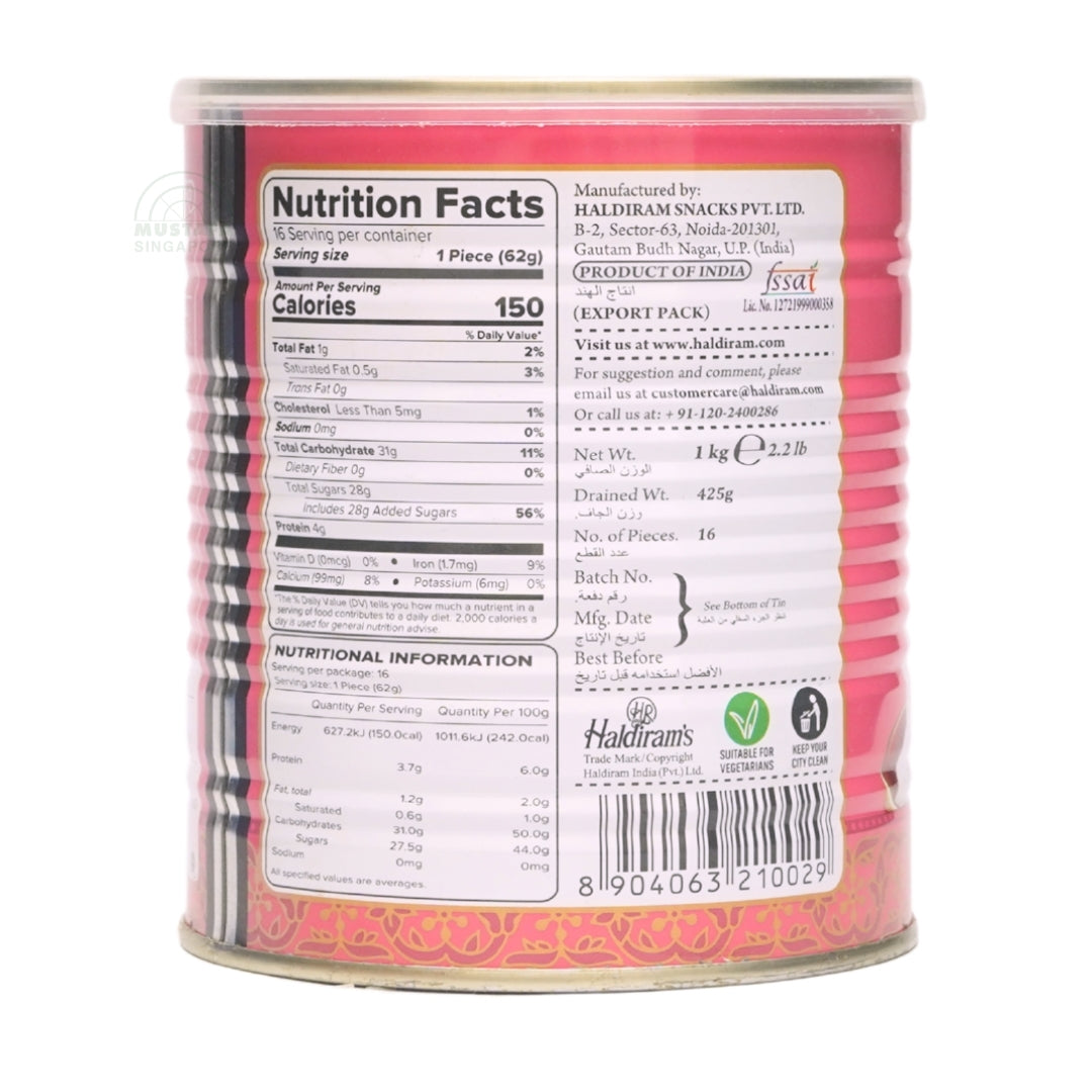 Haldiram’s Rasgulla are soft cottage cheese dumplings delicately simmered in rose-flavoured sugar syrup. This traditional Indian sweet offers a light, spongy, and melt-in-your-mouth texture—perfect as a dessert or festive treat.