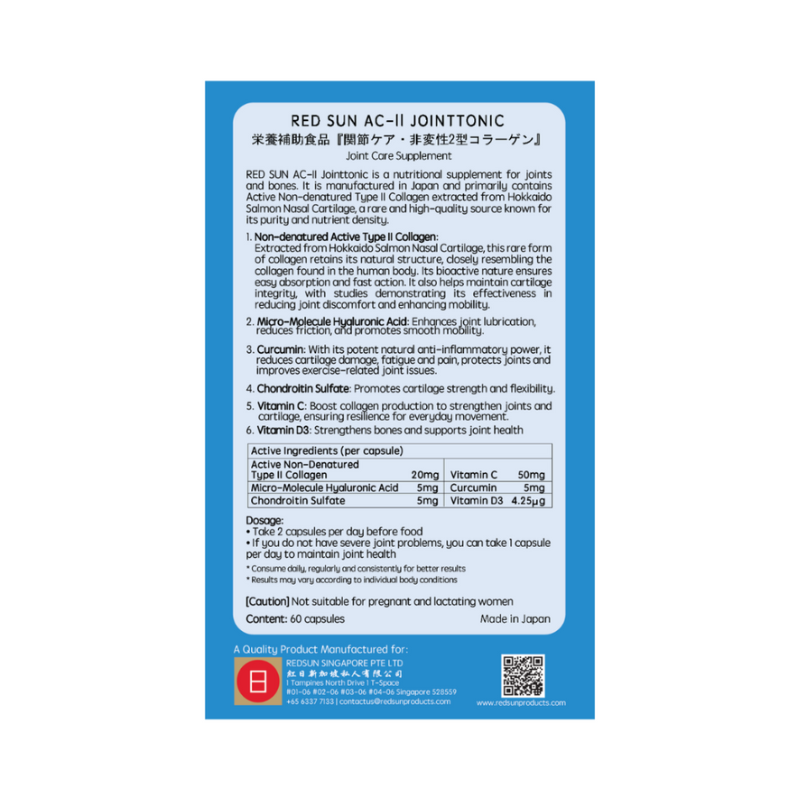 RED SUN AC-II Jointtonic is a Japan-made nutritional supplement formulated to support joint health. It contains active non-denatured type II collagen, hyaluronic acid, chondroitin sulfate, vitamin C, curcumin, and vitamin D3 to promote joint comfort, mobility, and overall bone health.
