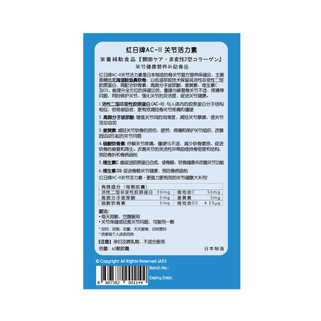 Per capsule contains active non-denatured type II collagen 20mg, micro-molecule hyaluronic acid 5mg, curcumin 5mg, chondroitin sulfate 5mg, vitamin C 50mg, vitamin D3 4.25µg