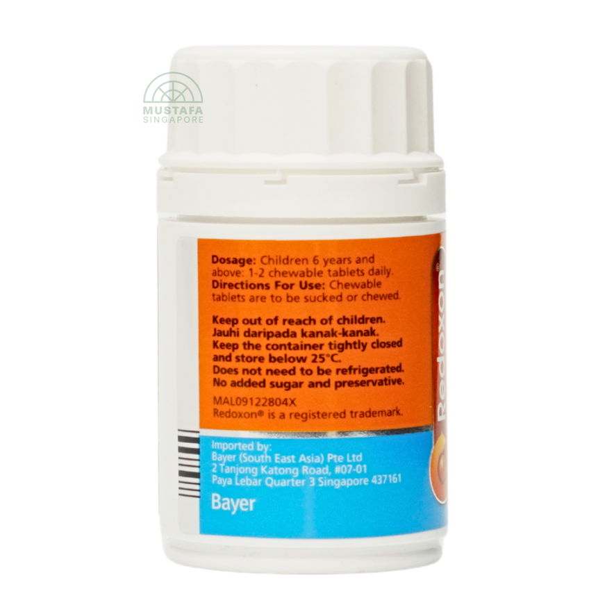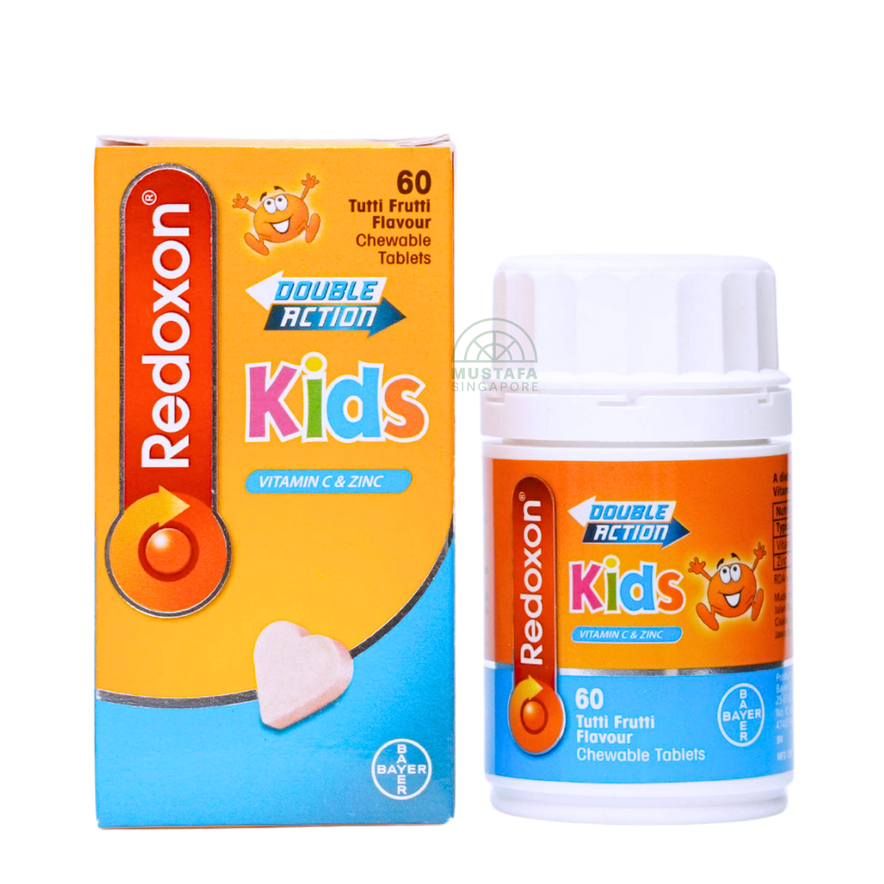 Redoxon Kids Double Action Chewable tablets combine Vitamin C and Zinc, specially formulated for children aged 6 years and older. The fun heart-shaped tablets come in a tasty tutti frutti flavor and are designed for daily immune support, with no added sugar or preservatives.