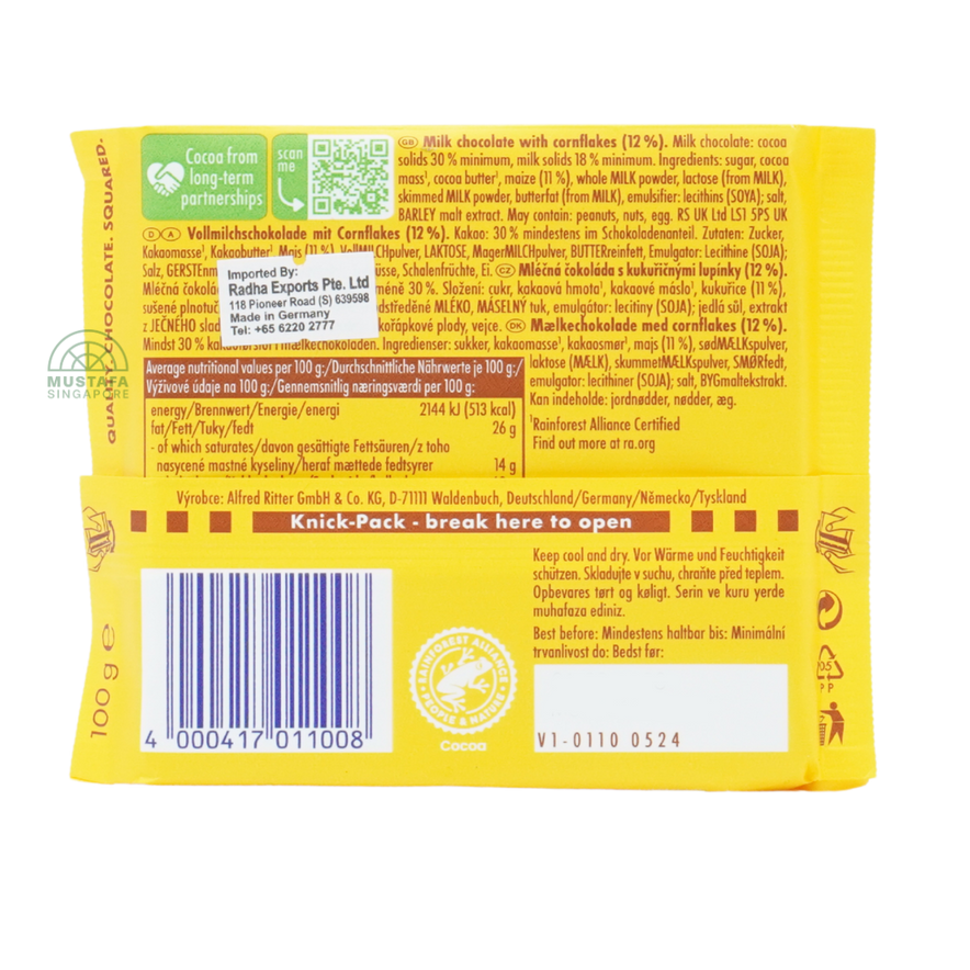 Ritter Sport Cornflakes blends crispy toasted cornflakes with smooth milk chocolate for a light, crunchy texture. Perfect for quick snacking or sharing with family and friends. The simple yet satisfying flavour appeals to all ages. A popular choice in the Ritter lineup. Crunchy, creamy and irresistibly delicious.