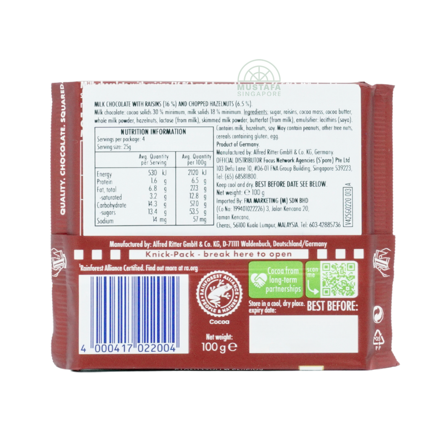 Ritter Sport Milk Chocolate with Raisins & Hazelnuts 100g