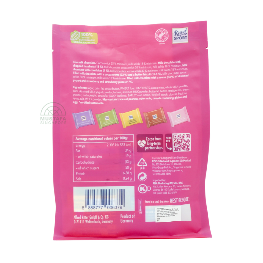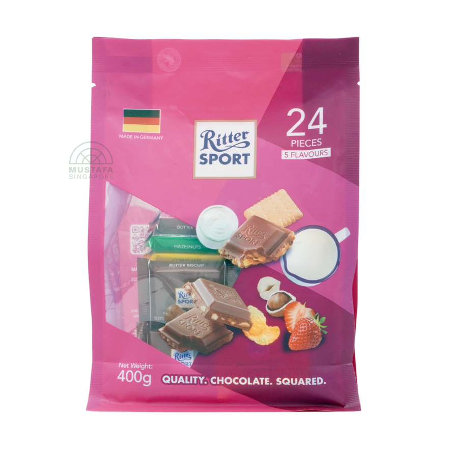 The Ritter Sport Mini Pouch contains 24 individually wrapped mini squares featuring a variety of Ritter Sport's classic flavours. Each piece delivers smooth chocolate with unique fillings ranging from nuts to crisp wafers. Perfect for sharing at gatherings, offices or family moments. The resealable pouch ensures freshness and convenience. A delightful assortment for chocolate lovers of all ages.