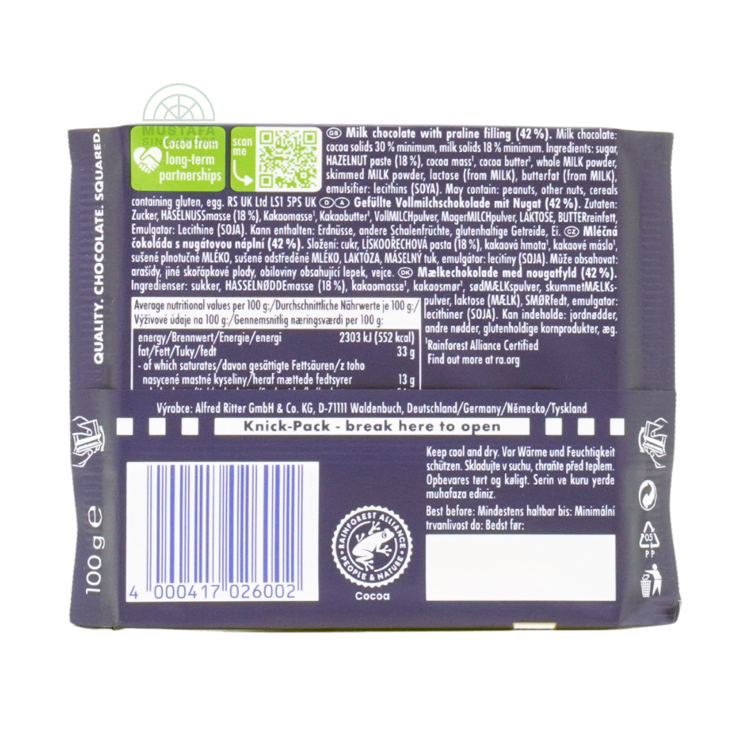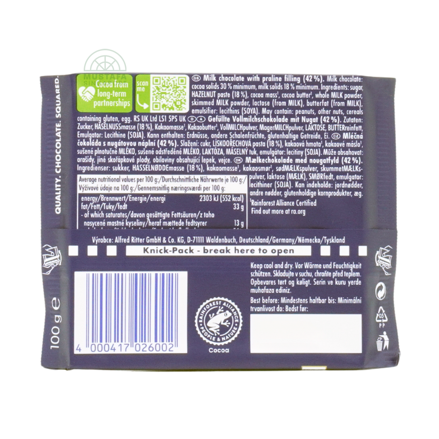 Ritter Sport Praline features a silky hazelnut cream filling encased in smooth milk chocolate. Each square melts effortlessly, providing a luxurious nutty flavour. Perfect for gifting, sharing or enjoying slowly. A classic favourite that showcases Ritter Sport's expertise in praline craftsmanship. A rich and satisfying indulgence.