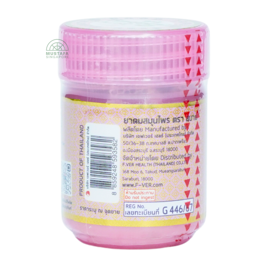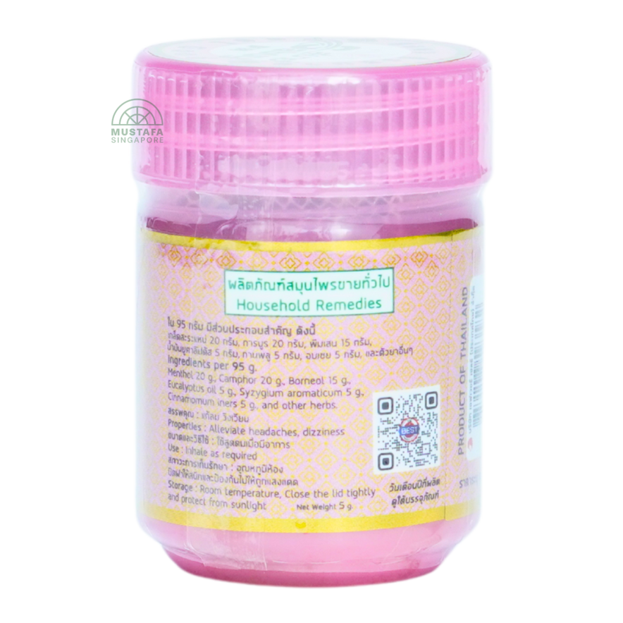 Menthol, camphor, borneol, eucalyptus oil, floral extracts and other Thai herbs.