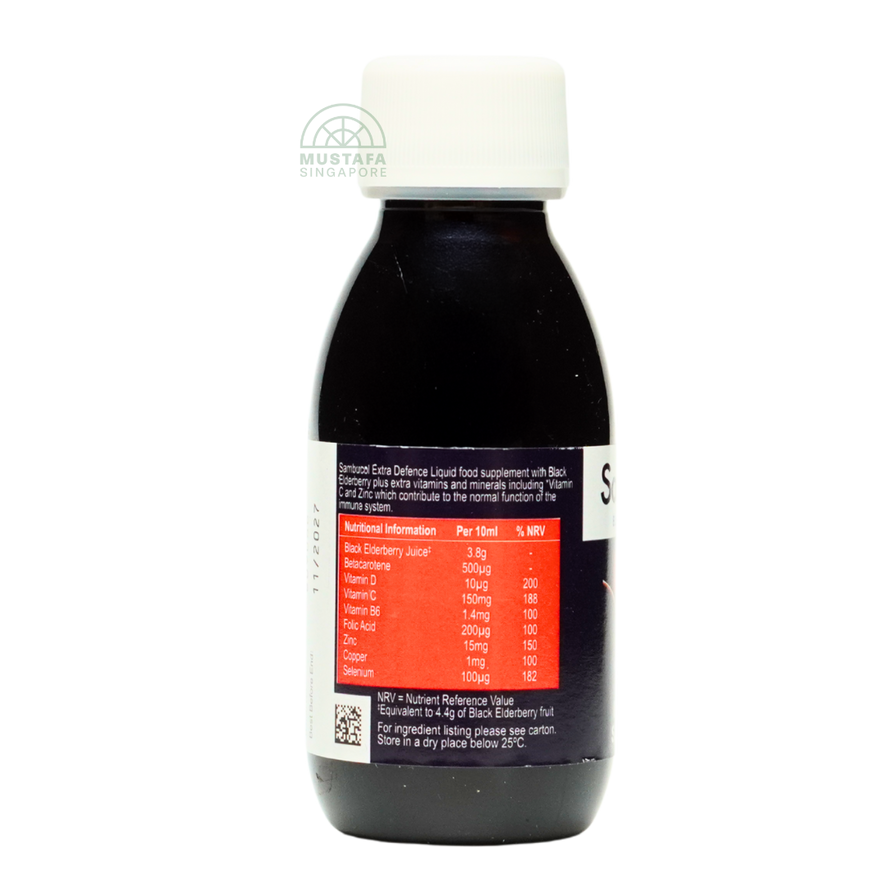 Glucose syrup, black elderberry juice (Sambucus nigra), purified water, Vitamin C (ascorbic acid), zinc gluconate, Vitamin B6 (pyridoxine hydrochloride), copper sulfate, betacarotene, folic acid, sodium selenite, Vitamin D (cholecalciferol), natural flavor (raspberry), citric acid, potassium sorbate