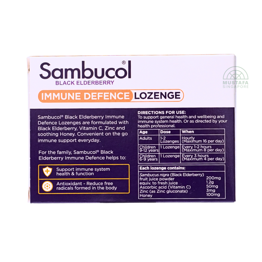 Each lozenge contains: Sambucus nigra (black elderberry) fruit juice powder 200 mg (equivalent to fresh juice 1.2 g), ascorbic acid (vitamin C) 50 mg, zinc (as zinc gluconate) 3 mg, honey 100 mg